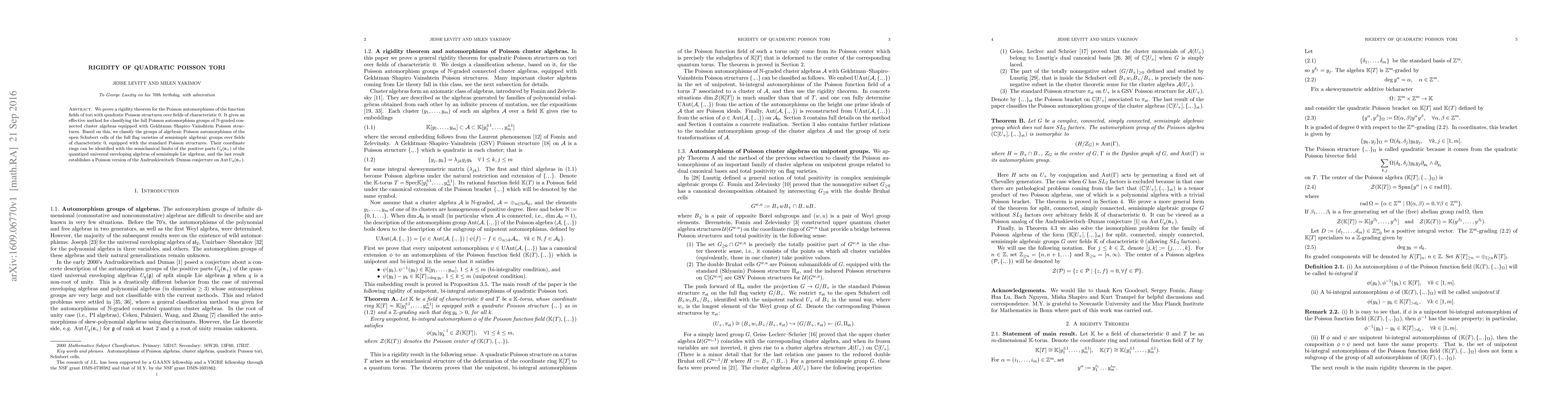 We prove a rigidity theorem for the Poisson automorphisms of the function fields of tori with quadratic Poisson structures over fields of characteristic 0. It gives an effective method for classifying the full Poisson automorphism groups of ${\mathbb{N}}$-graded connected cluster algebras equipped with Gekhtman-Shapiro-Vainshtein Poisson structures. Based on this, we classify the groups of algebraic Poisson automorphisms of the open Schubert cells of the full flag varieties of semisimple algebraic groups over fields of characteristic 0, equipped with the standard Poisson structures. Their coordinate rings can be identified with the semiclassical limits of the positive parts $U_q({\mathfrak{n}}_+)$ of the quantized universal enveloping algebras of semisimple Lie algebras, and the last result establishes a Poisson version of the Andruskiewitsch-Dumas conjecture on ${\mathrm{Aut}} U_q({\mathfrak{n}}_+)$.