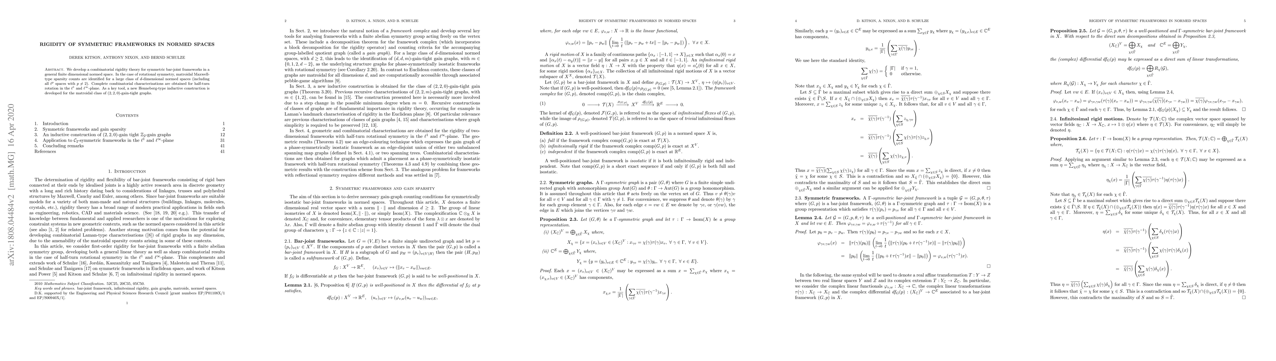 We develop a combinatorial rigidity theory for symmetric bar-joint frameworks in a general finite dimensional normed space. In the case of rotational symmetry, matroidal Maxwell-type sparsity counts are identified for a large class of $d$-dimensional normed spaces (including all $\ell^p$ spaces with $p\not=2$). Complete combinatorial characterisations are obtained for half-turn rotation in the $\ell^1$ and $\ell^\infty$-plane. As a key tool, a new Henneberg-type inductive construction is developed for the matroidal class of $(2,2,0)$-gain-tight graphs.