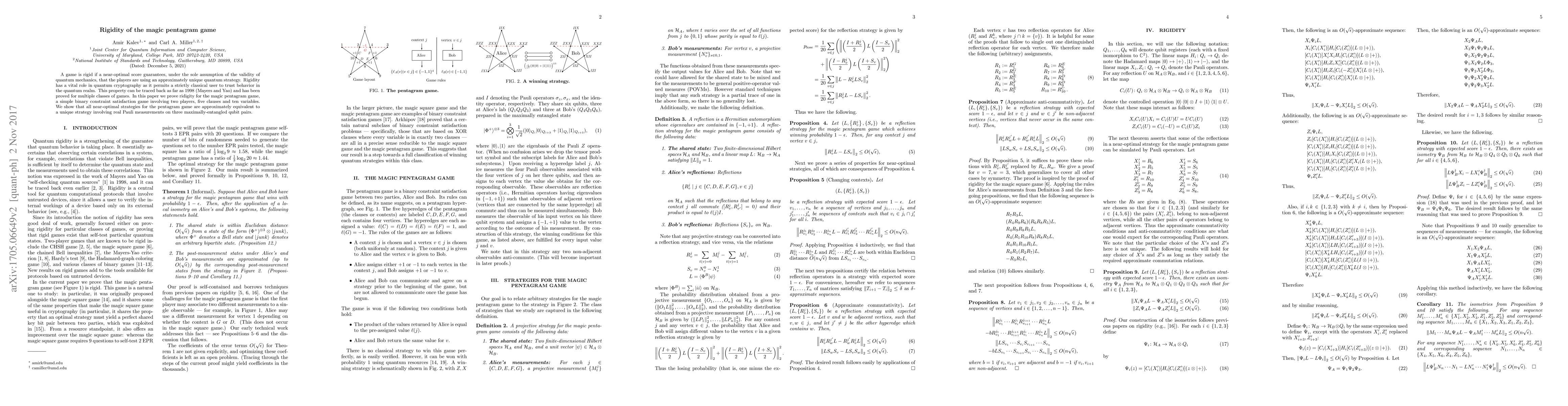 A game is rigid if a near-optimal score guarantees, under the sole assumption of the validity of quantum mechanics, that the players are using an approximately unique quantum strategy. Rigidity has a vital role in quantum cryptography as it permits a strictly classical user to trust behavior in the quantum realm. This property can be traced back as far as 1998 (Mayers and Yao) and has been proved for multiple classes of games. In this paper we prove ridigity for the magic pentagram game, a simple binary constraint satisfaction game involving two players, five clauses and ten variables. We show that all near-optimal strategies for the pentagram game are approximately equivalent to a unique strategy involving real Pauli measurements on three maximally-entangled qubit pairs.