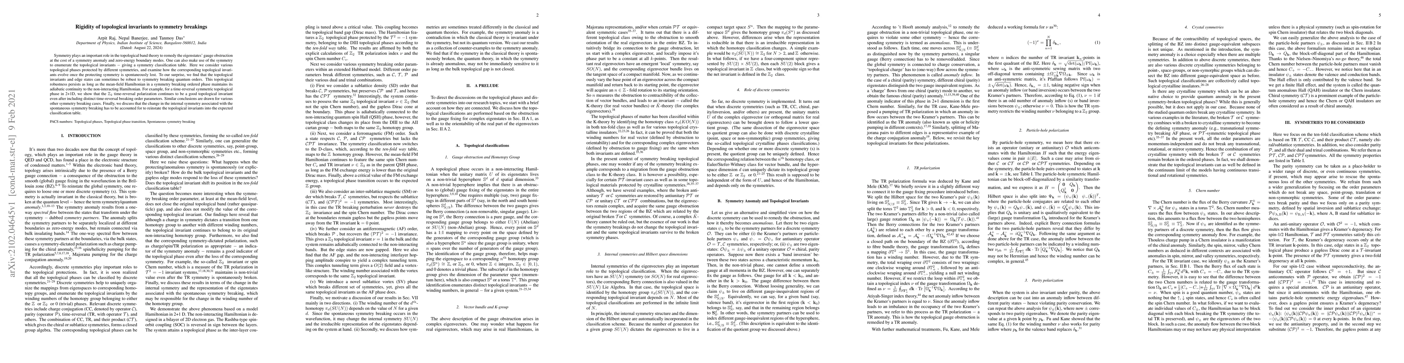 Symmetry plays an important role in the topological band theory to remedy the eigenstates' gauge obstruction at the cost of a symmetry anomaly and zero-energy boundary modes. One can also make use of the symmetry to enumerate the topological invariants - giving a symmetry classification table. Here we consider various topological phases protected by different symmetries, and examine how the corresponding topological invariants evolve once the protecting symmetry is spontaneously lost. To our surprise, we find that the topological invariants and edge states can sometimes be robust to symmetry breaking quantum orders. This topological robustness persists as long as the mean-field Hamiltonian in a symmetry breaking ordered phase maintains its adiabatic continuity to the non-interacting Hamiltonian. For example, for a time-reversal symmetric topological phase in 2+1D, we show that the Z_2 time-reversal polarization continues to be a good topological invariant even after including distinct time-reversal breaking order parameters. Similar conclusions are drawn for various other symmetry breaking cases. Finally, we discuss that the change in the internal symmetry associated with the spontaneous symmetry breaking has to be accounted for to reinstate the topological invariants into the expected classification table.
