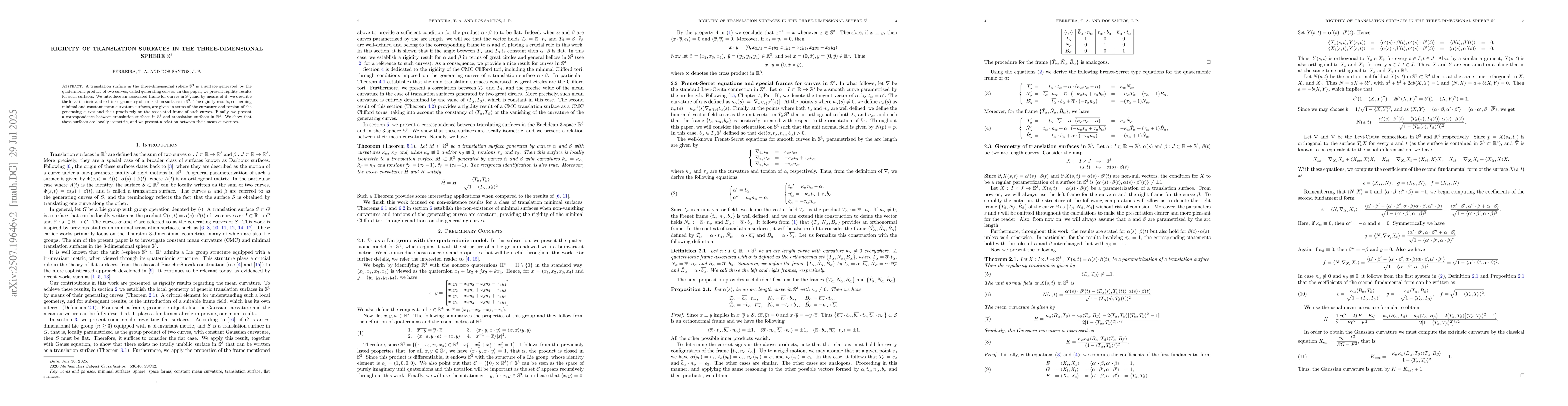 A translation surface in the three-dimensional sphere $\mathbb{S}^3$ is a surface generated by the quaternionic product of two curves, called generating curves. In this paper, we present rigidity results for such surfaces. We introduce an associated frame for curves in $\mathbb{S}^3$, and by means of it, we describe the local intrinsic and extrinsic geometry of translation surfaces in $\mathbb{S}^3$. The rigidity results, concerning minimal and constant mean curvature surfaces, are given in terms of the curvature and torsion of the generating curves and their proofs rely on the associated frame of such curves. Finally, we present a correspondence between translation surfaces in $\mathbb{S}^3$ and translation surfaces in $\mathbb{R}^3$. We show that these surfaces are locally isometric, and we present a relation between their mean curvatures.
