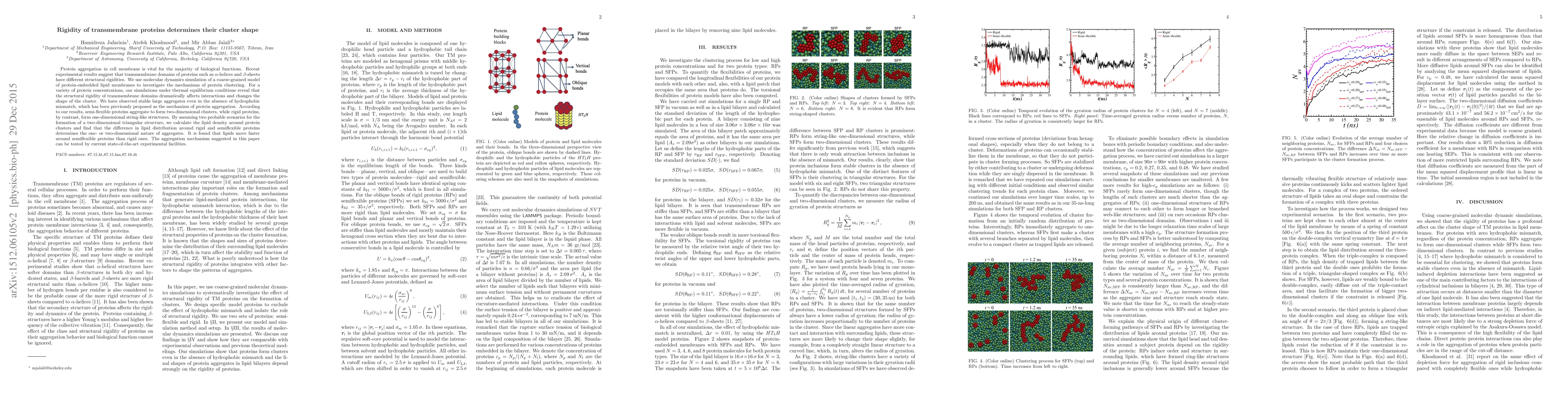 This paper uses molecular dynamics simulations to show that the structural rigidity of transmembrane protein domains influences protein clustering in cell membranes, leading to either two-dimensional clusters for semi-flexible proteins or one-dimensional string-like structures for rigid proteins, with lipid dynamics differing accordingly.