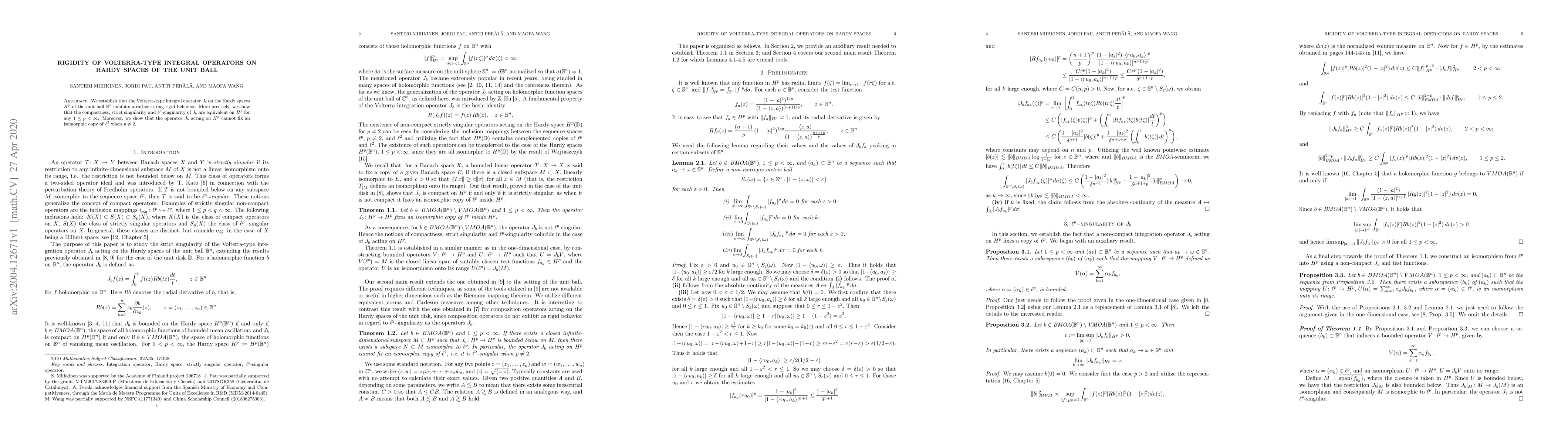 Summary: This paper demonstrates the rigidity of Volterra-type integral operators $J_b$ on Hardy spaces $H^p$ of the unit ball, proving equivalence of compactness, strict singularity, and $\ell^p$-singularity for $1 \le p < \infty$. It also shows that $J_b$ cannot fix an isomorphic copy of $\ell^2$ when $p \ne 2$.