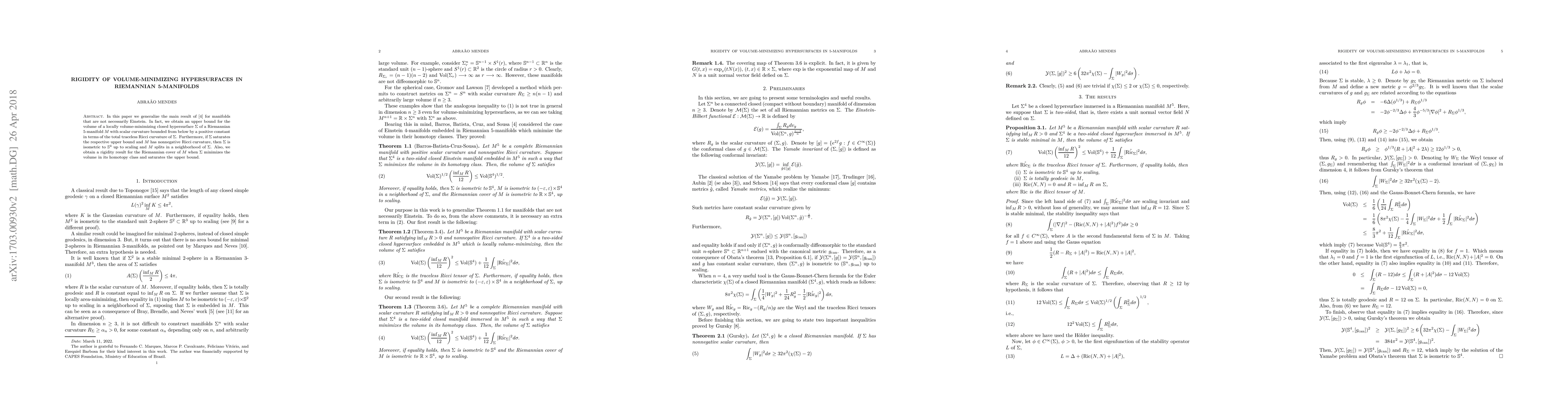 In this paper we generalize the main result of [4] for manifolds that are not necessarily Einstein. In fact, we obtain an upper bound for the volume of a locally volume-minimizing closed hypersurface $\Sigma$ of a Riemannian 5-manifold $M$ with scalar curvature bounded from below by a positive constant in terms of the total traceless Ricci curvature of $\Sigma$. Furthermore, if $\Sigma$ saturates the respective upper bound and $M$ has nonnegative Ricci curvature, then $\Sigma$ is isometric to $\mathbb{S}^4$ up to scaling and $M$ splits in a neighborhood of $\Sigma$. Also, we obtain a rigidity result for the Riemannian cover of $M$ when $\Sigma$ minimizes the volume in its homotopy class and saturates the upper bound.