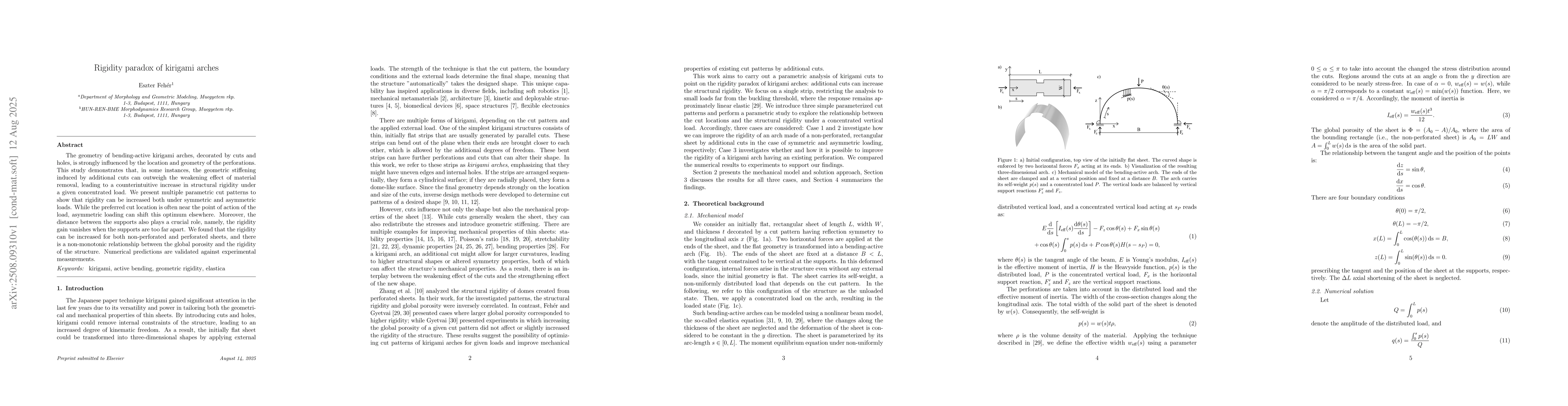 The geometry of bending-active kirigami arches, decorated by cuts and holes, is strongly influenced by the location and geometry of the perforations. This study demonstrates that, in some instances, the geometric stiffening induced by additional cuts can outweigh the weakening effect of material removal, leading to a counterintuitive increase in structural rigidity under a given concentrated load. We present multiple parametric cut patterns to show that rigidity can be increased both under symmetric and asymmetric loads. While the preferred cut location is often near the point of action of the load, asymmetric loading can shift this optimum elsewhere. Moreover, the distance between the supports also plays a crucial role, namely, the rigidity gain vanishes when the supports are too far apart. We found that the rigidity can be increased for both non-perforated and perforated sheets, and there is a non-monotonic relationship between the global porosity and the rigidity of the structure. Numerical predictions are validated against experimental measurements.