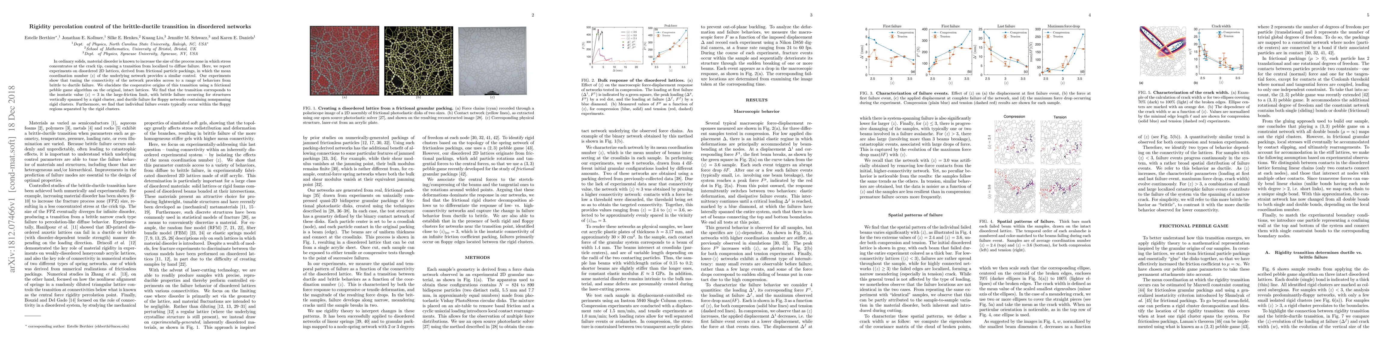 In ordinary solids, material disorder is known to increase the size of the process zone in which stress concentrates at the crack tip, causing a transition from localized to diffuse failure. Here, we report experiments on disordered 2D lattices, derived from frictional particle packings, in which the mean coordination number $\langle z \rangle$ of the underlying network provides a similar control. Our experiments show that tuning the connectivity of the network provides access to a range of behaviors from brittle to ductile failure. We elucidate the cooperative origins of this transition using a frictional pebble game algorithm on the original, intact lattices. We find that the transition corresponds to the isostatic value $\langle z \rangle = 3$ in the large-friction limit, with brittle failure occurring for structures vertically spanned by a rigid cluster, and ductile failure for floppy networks containing nonspanning rigid clusters. Furthermore, we find that individual failure events typically occur within the floppy regions separated by the rigid clusters.