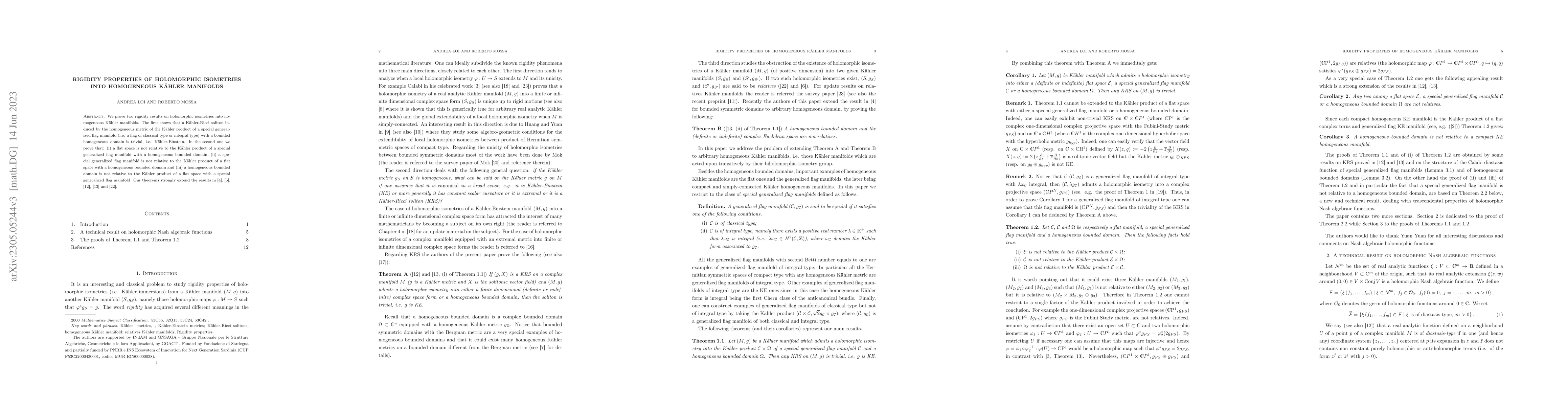 This paper proves two rigidity results for holomorphic isometries into homogeneous Kähler manifolds, showing that certain Kähler-Ricci solitons are trivial and that flat spaces, special flag manifolds, and homogeneous bounded domains cannot be relative to Kähler products under specified conditions. The results extend prior work in the field.