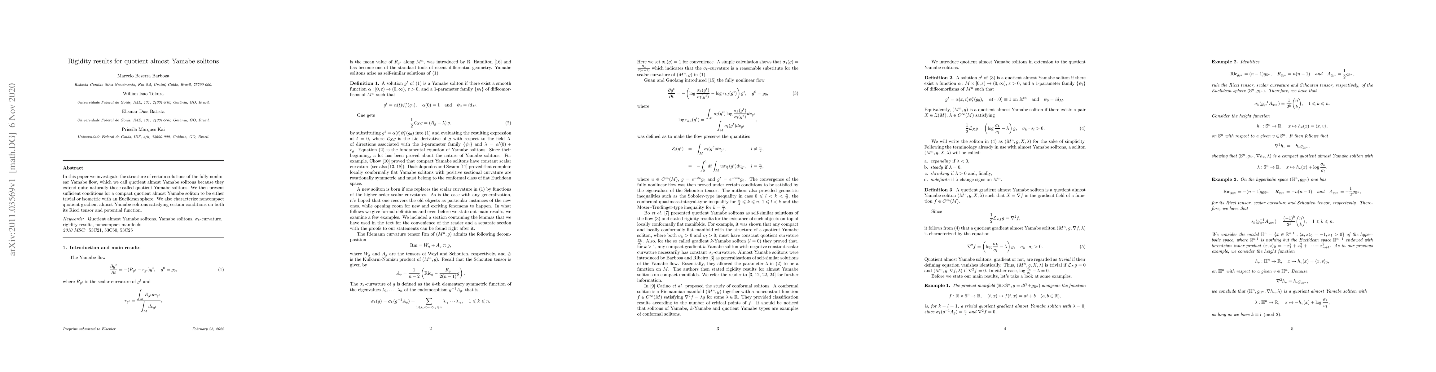 This paper examines quotient almost Yamabe solitons, solutions of the Yamabe flow, and provides conditions for them to be trivial or isometric to an Euclidean sphere. It also characterizes noncompact gradient solitons based on their Ricci tensor and potential function.
