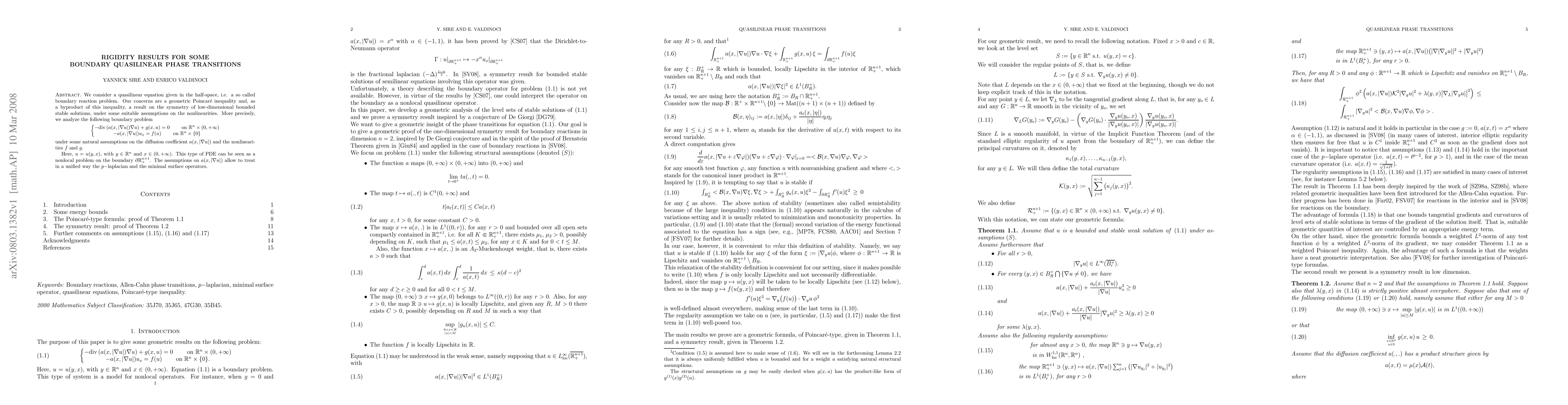 We consider a quasilinear equation given in the half-space, i.e. a so called boundary reaction problem. Our concerns are a geometric Poincar\'e inequality and, as a byproduct of this inequality, a result on the symmetry of low-dimensional bounded stable solutions, under some suitable assumptions on the nonlinearities. More precisely, we analyze the following boundary problem $$ \left\{\begin{matrix} -{\rm div} (a(x,|\nabla u|)\nabla u)+g(x,u)=0 \qquad {on $\R^n\times(0,+\infty)$} -a(x,|\nabla u|)u_x = f(u) \qquad{\mbox{on $\R^n\times\{0\}$}}\end{matrix} \right.$$ under some natural assumptions on the diffusion coefficient $a(x,|\nabla u|)$ and the nonlinearities $f$ and $g$. Here, $u=u(y,x)$, with $y\in\R^n$ and $x\in(0,+\infty)$. This type of PDE can be seen as a nonlocal problem on the boundary $\partial \R^{n+1}_+$. The assumptions on $a(x,|\nabla u|)$ allow to treat in a unified way the $p-$laplacian and the minimal surface operators.