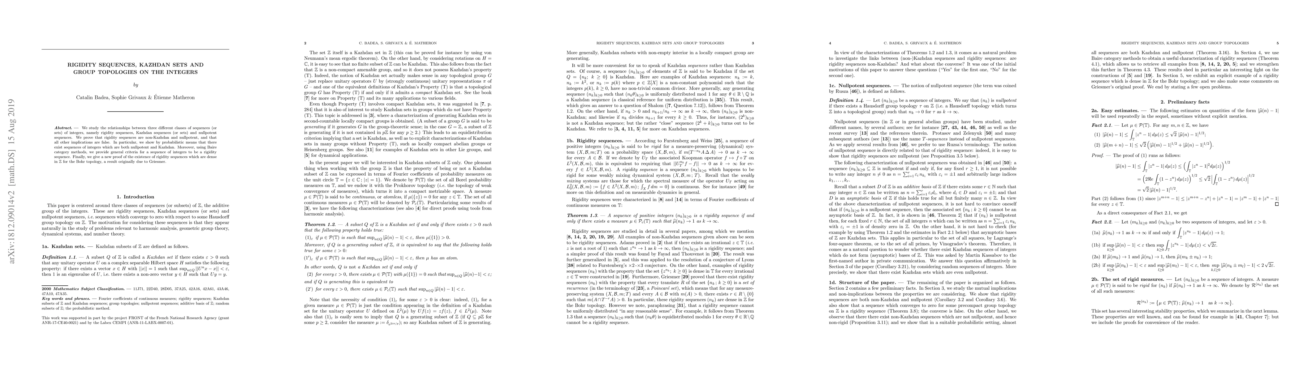 We study the relationships between three different classes of sequences (or sets) of integers, namely rigidity sequences, Kazhdan sequences (or sets) and nullpotent sequences. We prove that rigidity sequences are non-Kazhdan and nullpotent, and that all other implications are false. In particular, we show by probabilistic means that there exist sequences of integers which are both nullpotent and Kazhdan. Moreover, using Baire category methods, we provide general criteria for a sequence of integers to be a rigidity sequence. Finally, we give a new proof of the existence of rigidity sequences which are dense in $\mathbb{Z}$ for the Bohr topology, a result originally due to Griesmer.