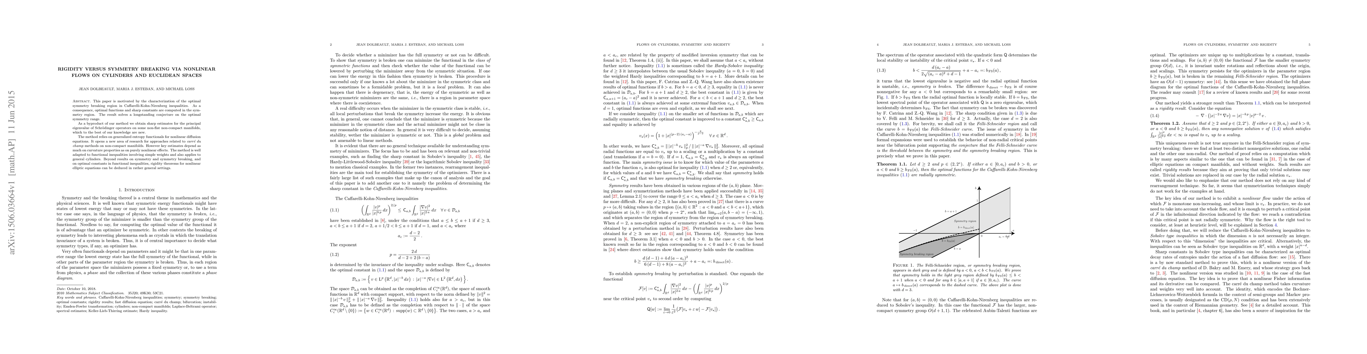 This paper is motivated by the characterization of the optimal symmetry breaking region in Caffarelli-Kohn-Nirenberg inequalities. As a consequence, optimal functions and sharp constants are computed in the symmetry region. The result solves a longstanding conjecture on the optimal symmetry range. As a byproduct of our method we obtain sharp estimates for the principal eigenvalue of Schr\"odinger operators on some non-flat non-compact manifolds, which to the best of our knowledge are new. The method relies on generalized entropy functionals for nonlinear diffusion equations. It opens a new area of research for approaches related to carr\'e du champ methods on non-compact manifolds. However key estimates depend as much on curvature properties as on purely nonlinear effects. The method is well adapted to functional inequalities involving simple weights and also applies to general cylinders. Beyond results on symmetry and symmetry breaking, and on optimal constants in functional inequalities, rigidity theorems for nonlinear elliptic equations can be deduced in rather general settings.