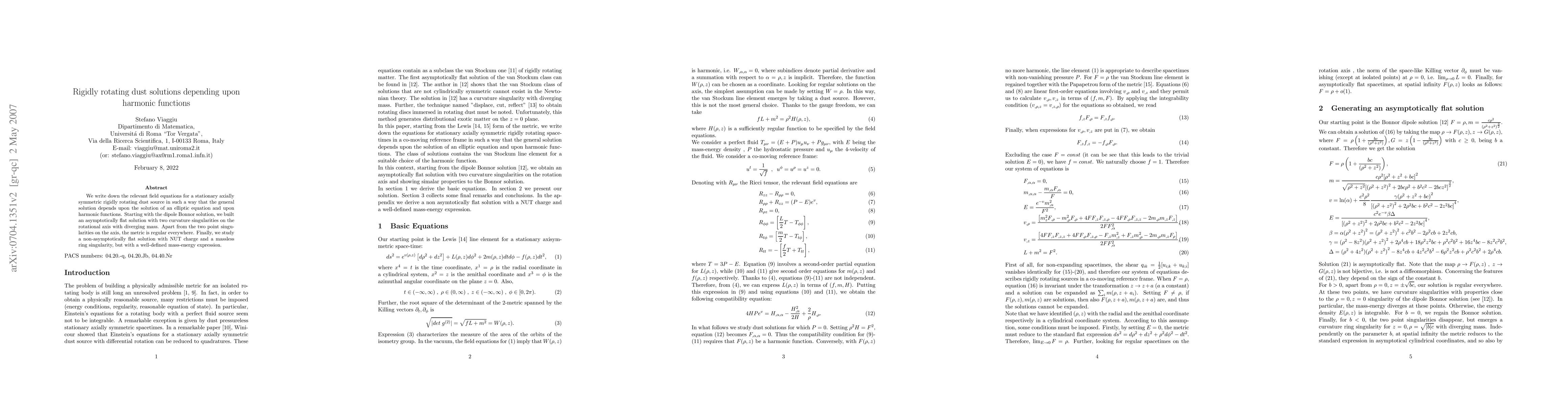 This paper explores stationary, axially symmetric, rigidly rotating dust solutions, deriving field equations that depend on elliptic equations and harmonic functions. It constructs an asymptotically flat solution with two curvature singularities along the rotational axis, and also examines a non-asymptotically flat solution featuring a NUT charge and a massless ring singularity with a defined mass-energy.
