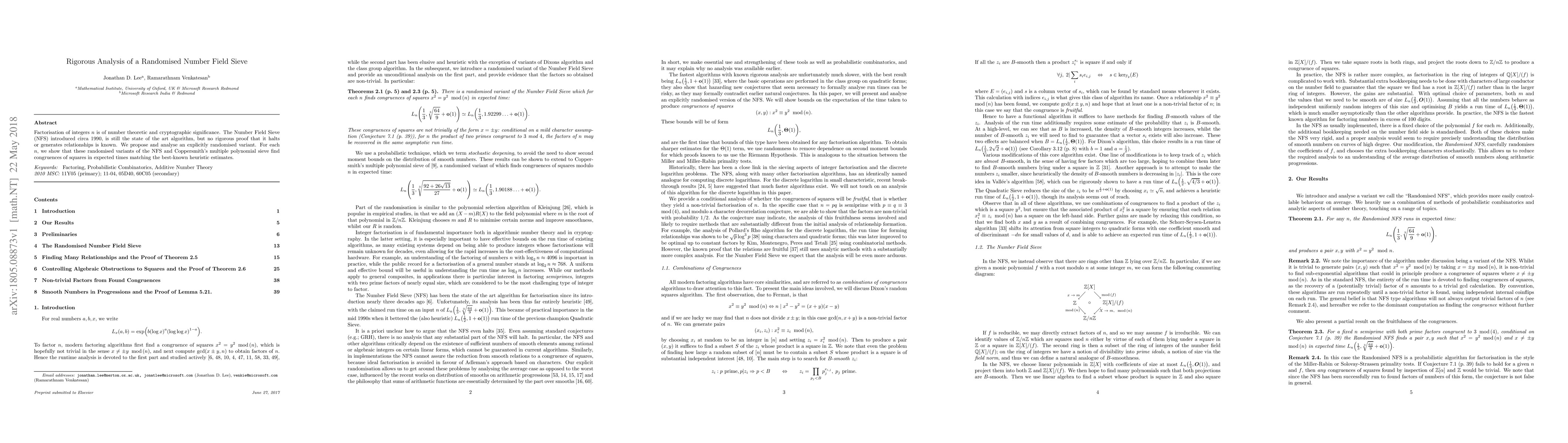 This paper proposes and rigorously analyses a randomised variant of the Number Field Sieve (NFS) to factor integers, demonstrating that it finds congruences of squares in expected times that match the best heuristic estimates, though it does not provide a proof of its halting or correctness.