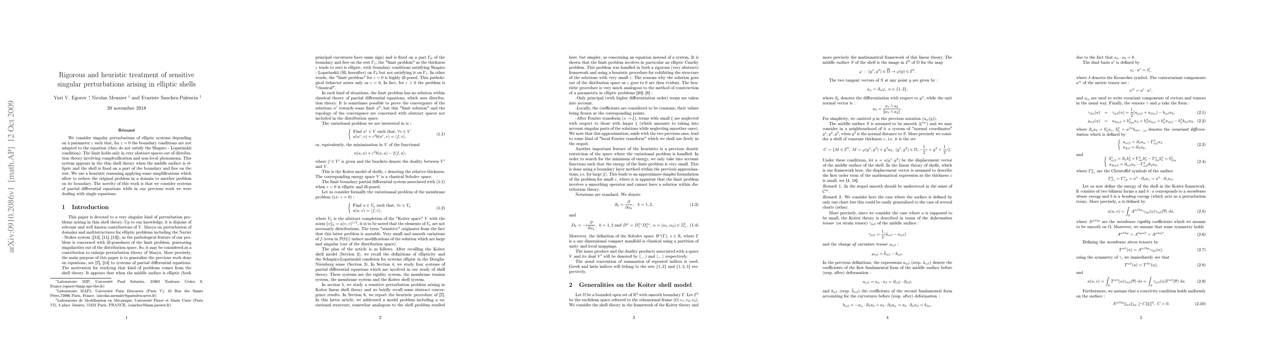We consider singular perturbations of elliptic systems depending on a parameter ? such that, for ? = 0 the boundary conditions are not adapted to the equation (they do not satisfy the Shapiro - Lopatinskii condition). The limit holds only in very abstract spaces out of distribu- tion theory involving complexi?cation and non-local phenomena. This system appears in the thin shell theory when the middle surface is el- liptic and the shell is fixed on a part of the boundary and free on the rest. We use a heuristic reasoning applying some simplifications which allow to reduce the original problem in a domain to another problem on its boundary. The novelty of this work is that we consider systems of partial differential equations while in our previous work we were dealing with single equations.