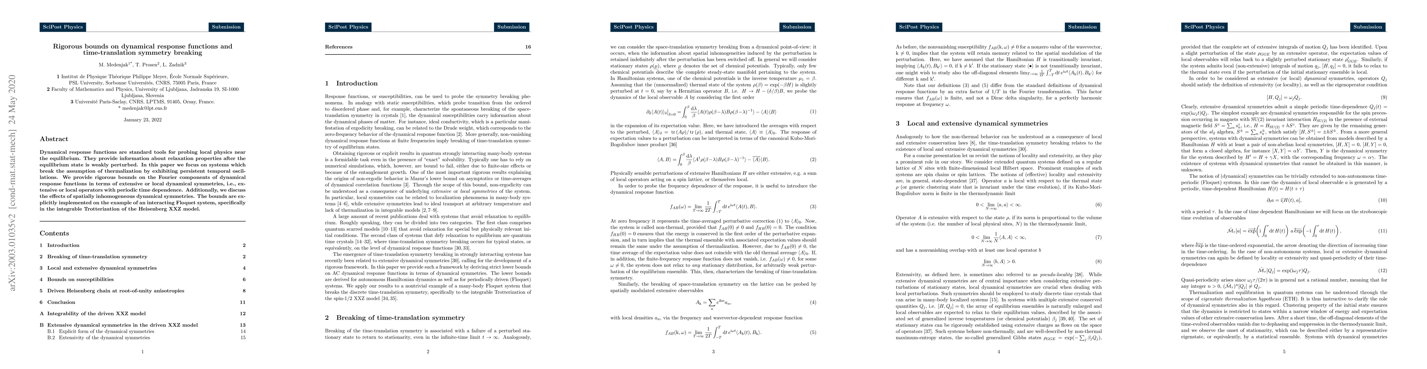 This paper rigorously bounds the Fourier components of dynamical response functions for systems that persistently oscillate without thermalizing, linking these bounds to extensive or local dynamical symmetries. It applies these bounds to an integrable Trotterization of the Heisenberg XXZ model, highlighting the effects of spatially inhomogeneous dynamical symmetries.