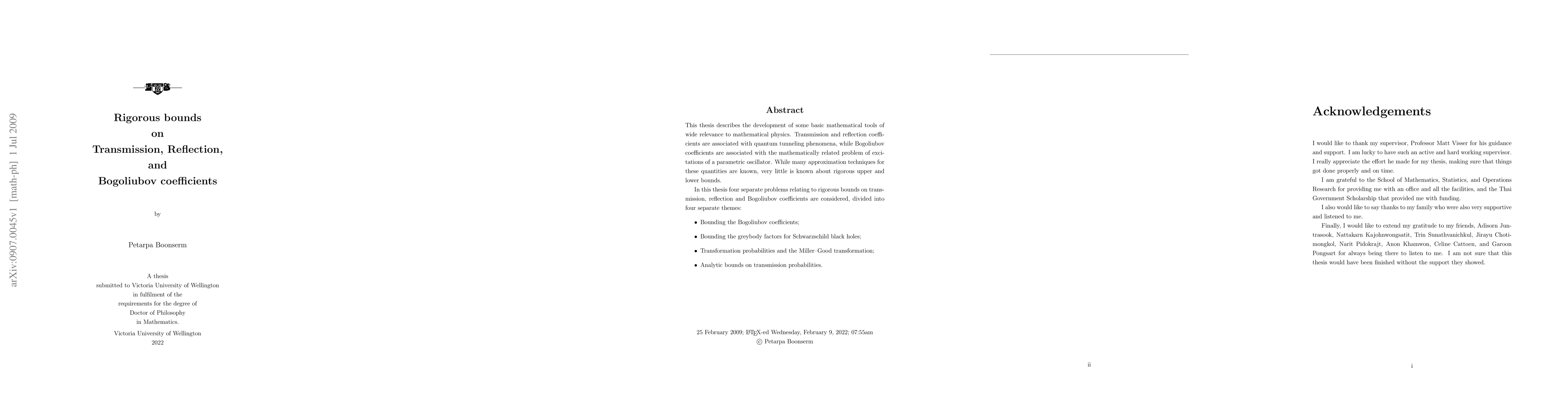 This thesis describes the development of some basic mathematical tools of wide relevance to mathematical physics. Transmission and reflection coefficients are associated with quantum tunneling phenomena, while Bogoliubov coefficients are associated with the mathematically related problem of excitations of a parametric oscillator. While many approximation techniques for these quantities are known, very little is known about rigorous upper and lower bounds. In this thesis four separate problems relating to rigorous bounds on transmission, reflection and Bogoliubov coefficients are considered, divided into four separate themes: 1) Bounding the Bogoliubov coefficients; 2) Bounding the greybody factors for Schwarzschild black holes; 3) Transformation probabilities and the Miller--Good transformation; 4) Analytic bounds on transmission probabilities.