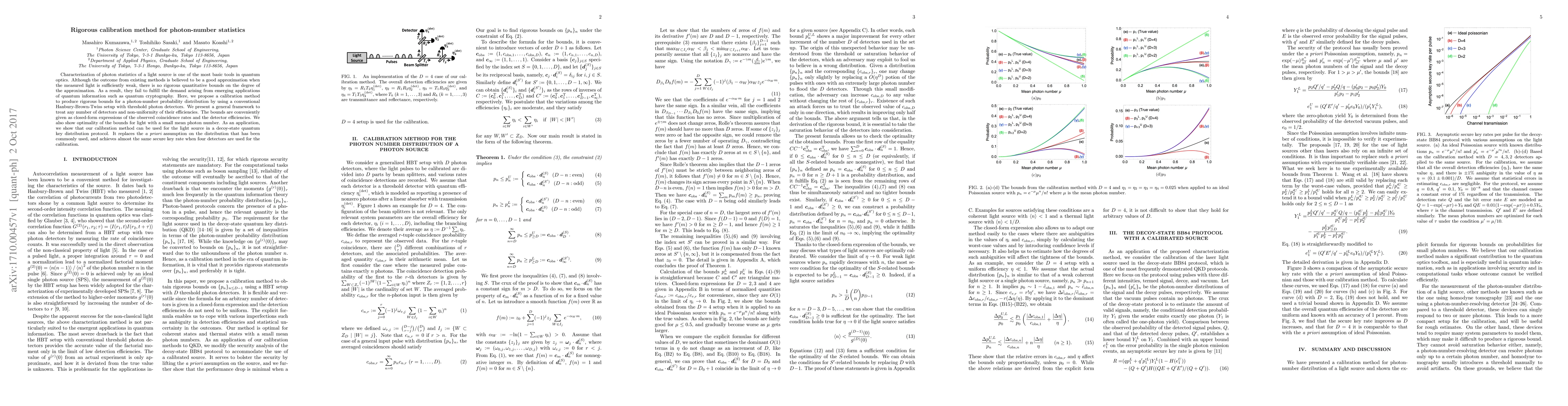 This paper proposes a rigorous calibration method for determining photon-number statistics using a Hanbury-Brown-Twiss setup, providing quantitative bounds for photon-number probability distributions. The method achieves optimal results for light with a small mean photon number and enhances the security of quantum key distribution protocols.