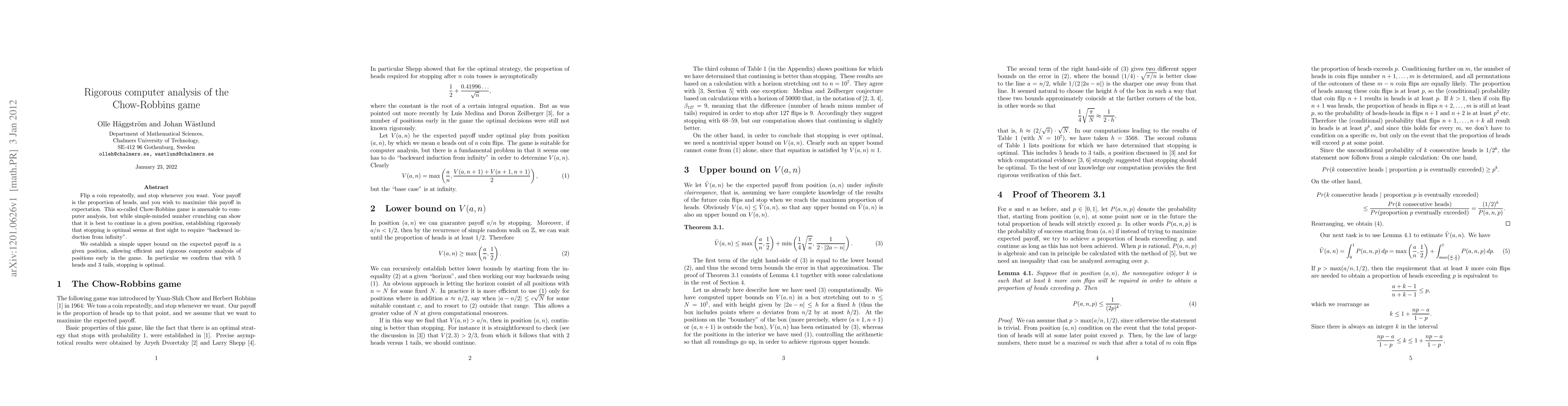Flip a coin repeatedly, and stop whenever you want. Your payoff is the proportion of heads, and you wish to maximize this payoff in expectation. This so-called Chow-Robbins game is amenable to computer analysis, but while simple-minded number crunching can show that it is best to continue in a given position, establishing rigorously that stopping is optimal seems at first sight to require "backward induction from infinity". We establish a simple upper bound on the expected payoff in a given position, allowing efficient and rigorous computer analysis of positions early in the game. In particular we confirm that with 5 heads and 3 tails, stopping is optimal.