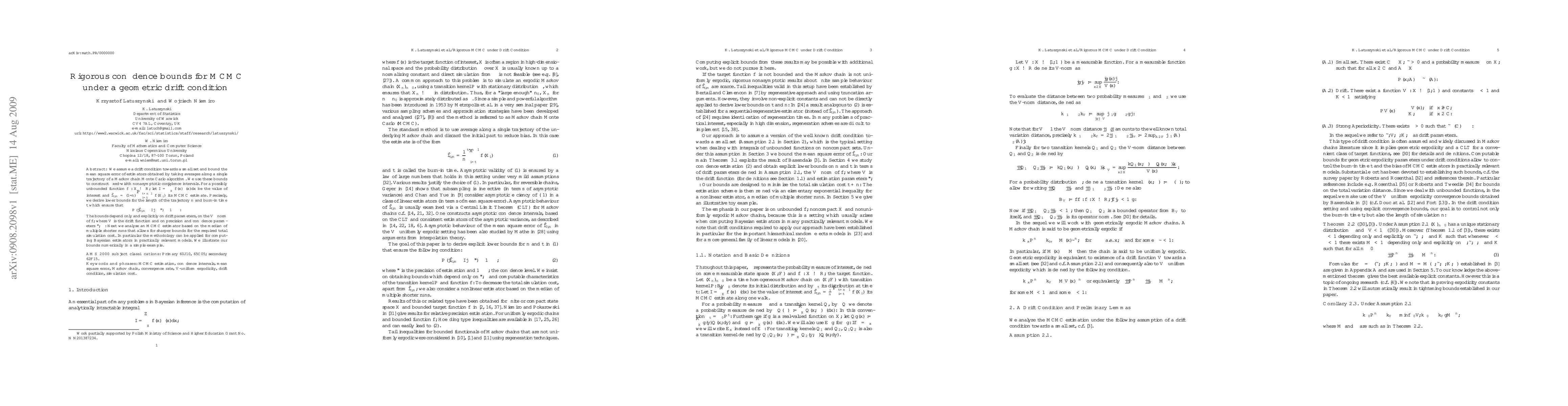 This paper develops rigorous confidence bounds for Markov Chain Monte Carlo (MCMC) under a geometric drift condition, providing nonasymptotic confidence intervals for estimators. It derives explicit bounds for trajectory and burn-in times based on drift parameters, function norms, and desired precision and confidence levels.