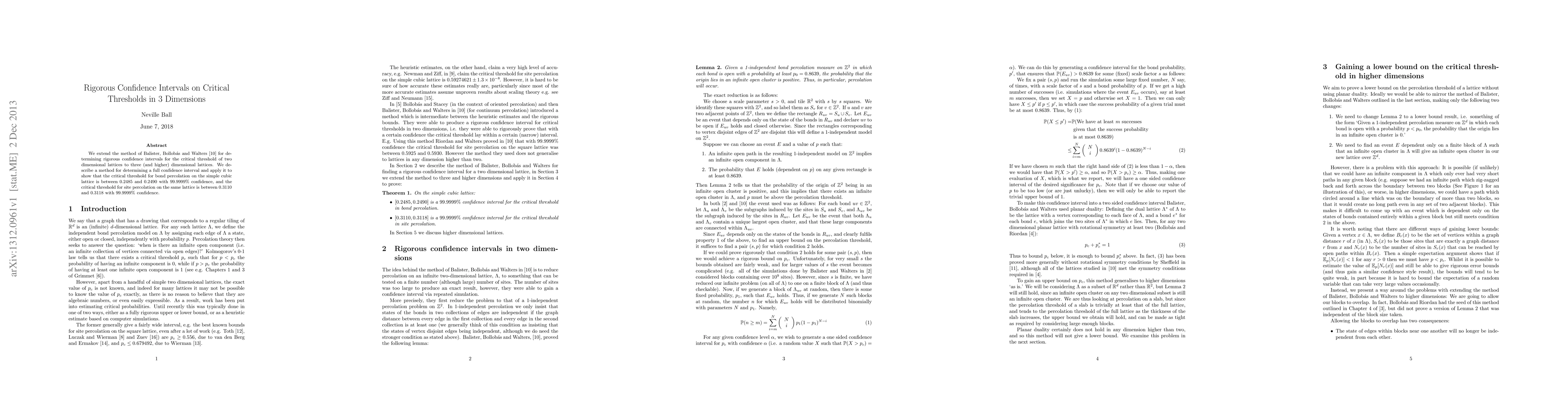 This paper extends the method for rigorous confidence intervals on critical thresholds to three-dimensional lattices, applying it to determine precise bounds for bond and site percolation thresholds on the simple cubic lattice with high confidence.