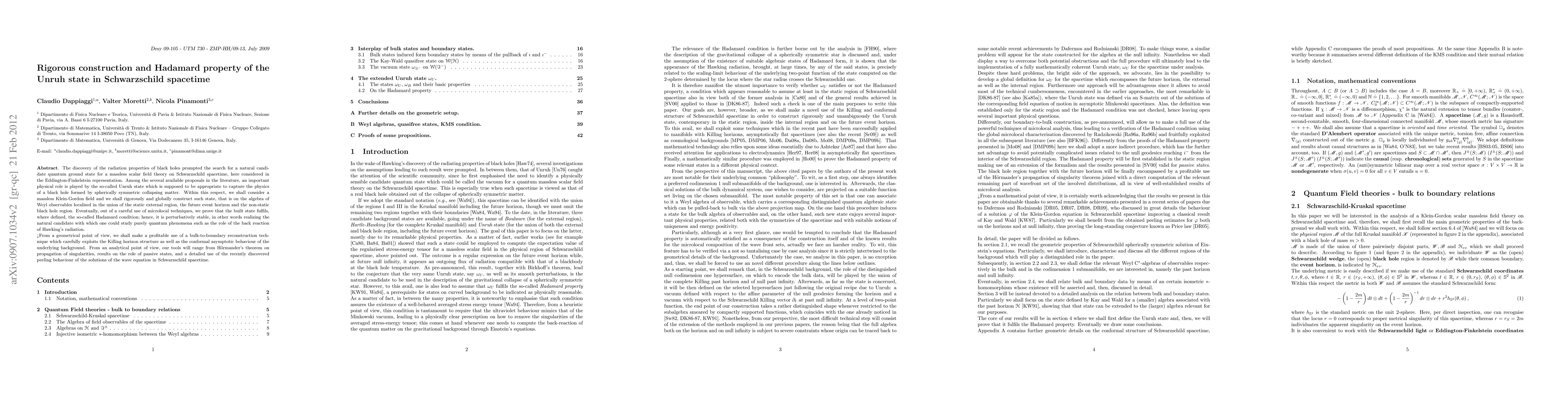 The discovery of the radiation properties of black holes prompted the search for a natural candidate quantum ground state for a massless scalar field theory on Schwarzschild spacetime, here considered in the Eddington-Finkelstein representation. Among the several available proposals in the literature, an important physical role is played by the so-called Unruh state which is supposed to be appropriate to capture the physics of a black hole formed by spherically symmetric collapsing matter. Within this respect, we shall consider a massless Klein-Gordon field and we shall rigorously and globally construct such state, that is on the algebra of Weyl observables localised in the union of the static external region, the future event horizon and the non-static black hole region. Eventually, out of a careful use of microlocal techniques, we prove that the built state fulfils, where defined, the so-called Hadamard condition; hence, it is perturbatively stable, in other words realizing the natural candidate with which one could study purely quantum phenomena such as the role of the back reaction of Hawking's radiation. From a geometrical point of view, we shall make a profitable use of a bulk-to-boundary reconstruction technique which carefully exploits the Killing horizon structure as well as the conformal asymptotic behaviour of the underlying background. From an analytical point of view, our tools will range from Hormander's theorem on propagation of singularities, results on the role of passive states, and a detailed use of the recently discovered peeling behaviour of the solutions of the wave equation in Schwarzschild spacetime.