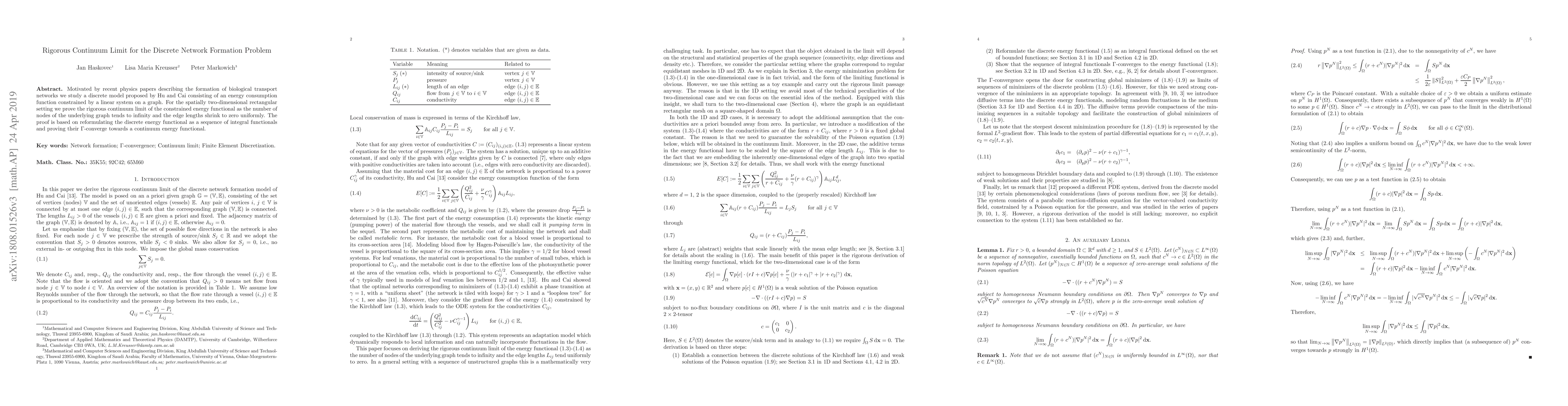 This paper rigorously proves the continuum limit of a discrete network formation model, originally proposed by Hu and Cai, as the number of nodes increases and edge lengths shrink. The authors reformulate the discrete energy functional as integral functionals and demonstrate their convergence to a continuum energy functional.