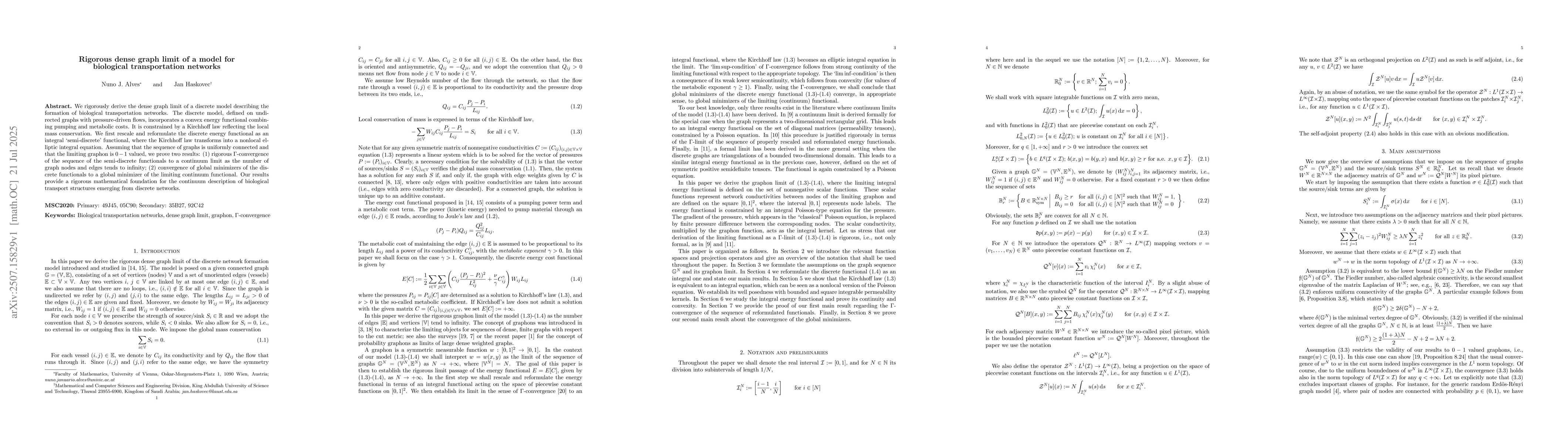 We rigorously derive the dense graph limit of a discrete model describing the formation of biological transportation networks. The discrete model, defined on undirected graphs with pressure-driven flows, incorporates a convex energy functional combining pumping and metabolic costs. It is constrained by a Kirchhoff law reflecting the local mass conservation. We first rescale and reformulate the discrete energy functional as an integral `semi-discrete' functional, where the Kirchhoff law transforms into a nonlocal elliptic integral equation. Assuming that the sequence of graphs is uniformly connected and that the limiting graphon is 0-1 valued, we prove two results: (1) rigorous Gamma-convergence of the sequence of the semi-discrete functionals to a continuum limit as the number of graph nodes and edges tends to infinity; (2) convergence of global minimizers of the discrete functionals to a global minimizer of the limiting continuum functional. Our results provide a rigorous mathematical foundation for the continuum description of biological transport structures emerging from discrete networks.