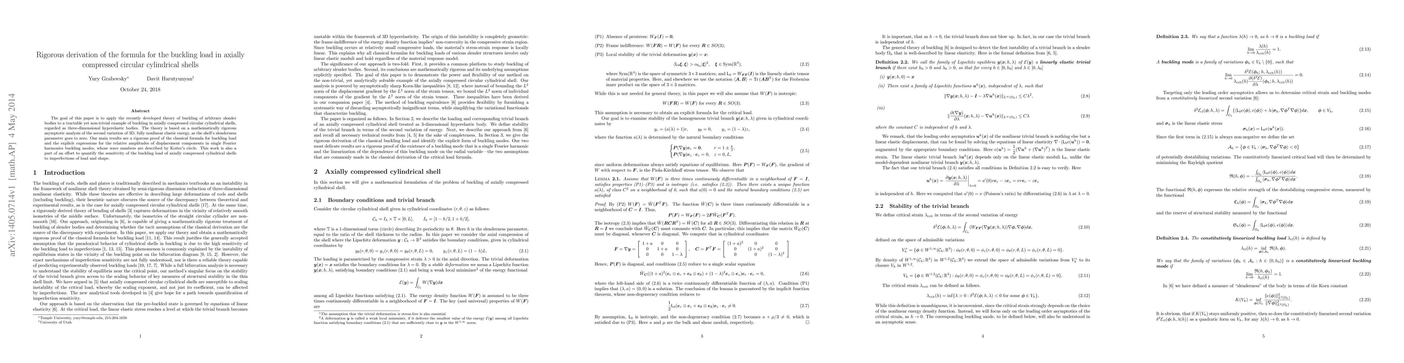 This paper rigorously derives the buckling load formula for axially compressed circular cylindrical shells using a new theory for slender bodies. It provides a proof of the classical buckling load formula and explicit expressions for displacement amplitudes in buckling modes, contributing to the understanding of how imperfections affect buckling loads.