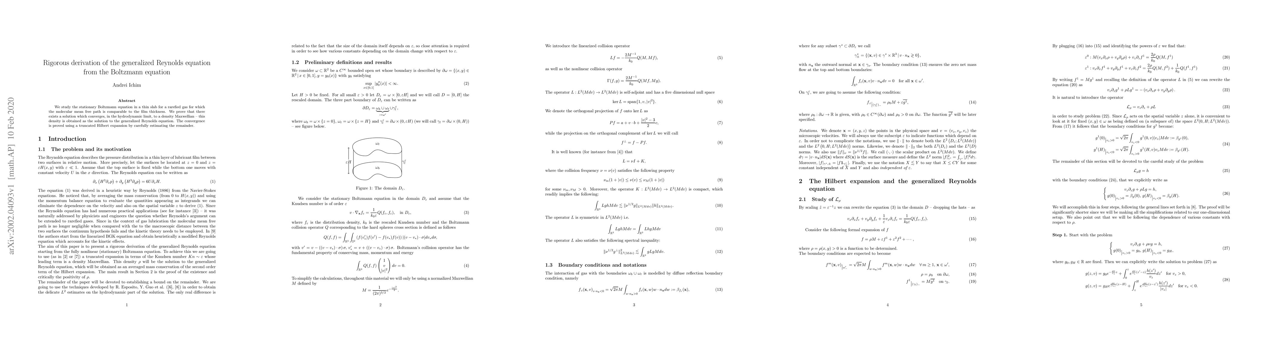 This paper rigorously derives the generalized Reynolds equation from the stationary Boltzmann equation for a rarefied gas in a thin slab. It demonstrates the convergence of the solution to a density Maxwellian in the hydrodynamic limit, using a truncated Hilbert expansion and careful estimation of the remainder.