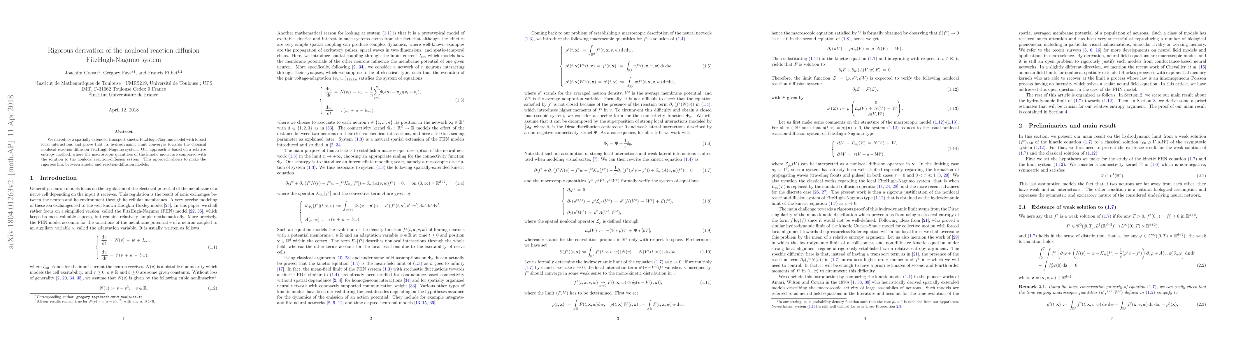 This paper rigorously derives the nonlocal reaction-diffusion FitzHugh-Nagumo system from a spatially extended transport kinetic model using a relative entropy method. It demonstrates the convergence of the hydrodynamic limit of the kinetic model to the classical nonlocal reaction-diffusion system.