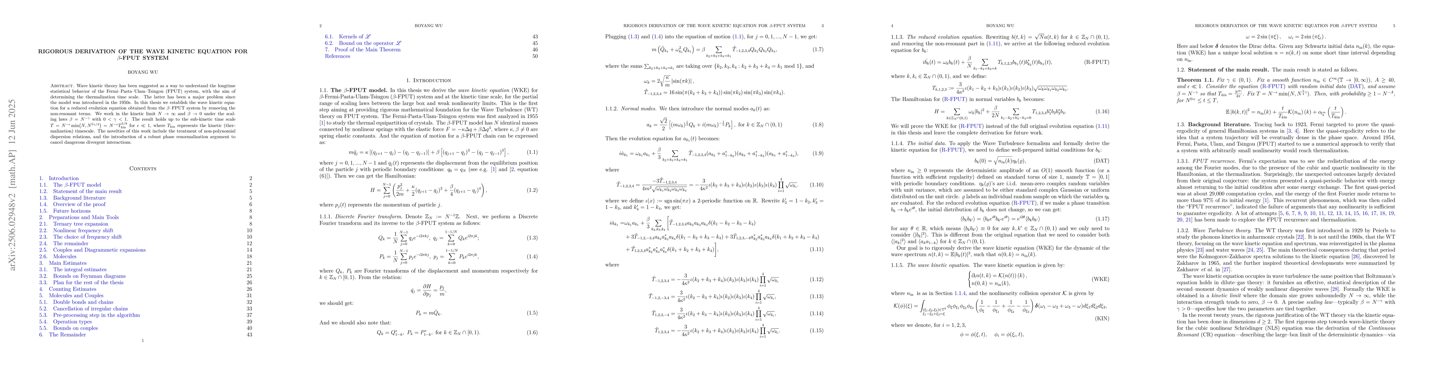 Wave kinetic theory has been suggested as a way to understand the longtime statistical behavior of the Fermi-Pasta-Ulam-Tsingou (FPUT) system, with the aim of determining the thermalization time scale. The latter has been a major problem since the model was introduced in the 1950s. In this thesis we establish the wave kinetic equation for a reduced evolution equation obtained from the $\beta$-FPUT system by removing the non-resonant terms. We work in the kinetic limit $N\to \infty$ and $\beta\to 0$ under the scaling laws $\beta=N^{-\gamma}$ with $0<\gamma<1$. The result holds up to the sub-kinetic time scale $T=N^{-\epsilon}\min\bigl(N,N^{5\gamma/4}\bigr)=N^{-\epsilon}T_{\mathrm{kin}}^{5/8}$ for $\epsilon\ll 1$, where $T_{\mathrm{kin}}$ represents the kinetic (thermalization) timescale. The novelties of this work include the treatment of non-polynomial dispersion relations, and the introduction of a robust phase renormalization argument to cancel dangerous divergent interactions.