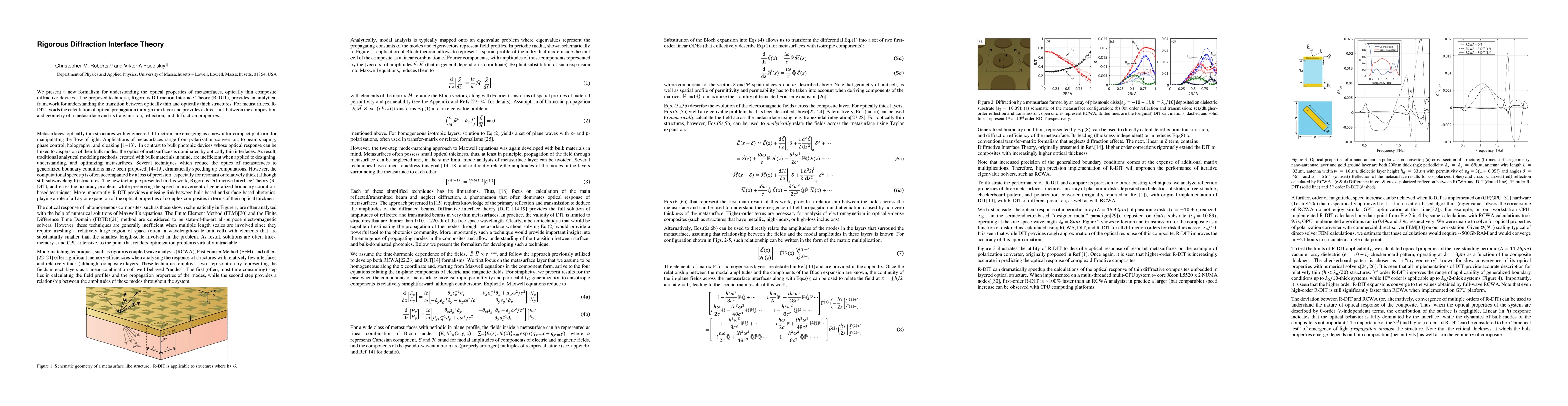 We present a new formalism for understanding the optical properties of metasurfaces, optically thin composite diffractive devices. The proposed technique, Rigorous Diffraction Interface Theory (R-DIT), provides an analytical framework for understanding the transition between optically thin and optically thick structures. For metasurfaces, R-DIT avoids the calculation of optical propagation through thin layer and provides a direct link between the composition and geometry of a metasurface and its transmission, reflection, and diffraction properties.