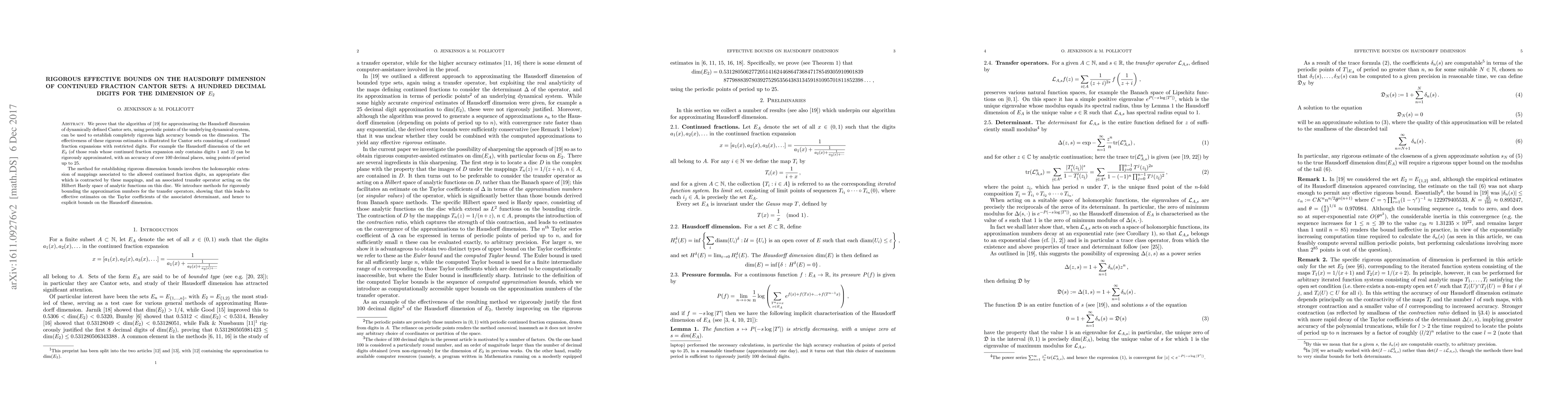 This paper rigorously establishes high accuracy bounds for the Hausdorff dimension of Cantor sets derived from continued fraction expansions with restricted digits, achieving over 100 decimal places for the dimension of $E_2$. The method employs holomorphic extensions, contraction mappings, and transfer operators to derive these bounds.