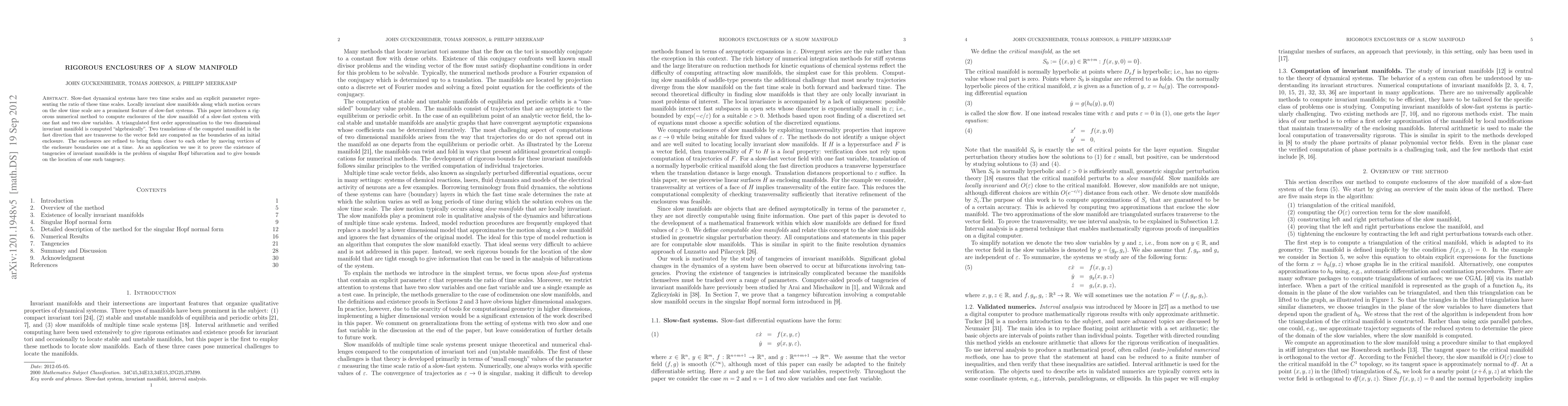 This paper presents a rigorous numerical method to compute enclosures of the slow manifold in slow-fast dynamical systems, refining initial approximations by moving boundary vertices, and applies the method to prove the existence of tangencies in singular Hopf bifurcation scenarios.