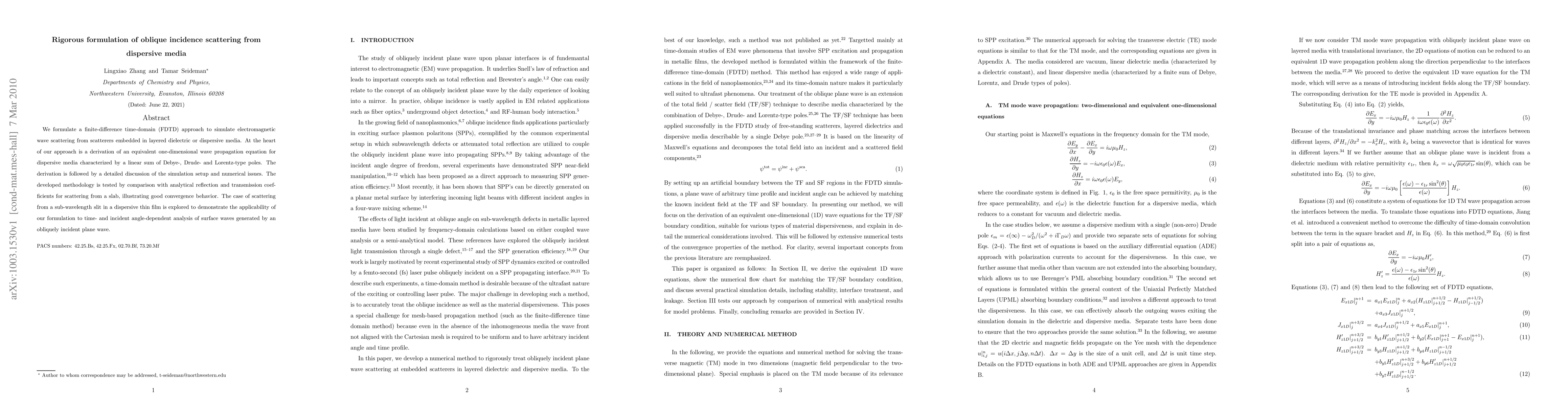 We formulate a finite-difference time-domain (FDTD) approach to simulate electromagnetic wave scattering from scatterers embedded in layered dielectric or dispersive media. At the heart of our approach is a derivation of an equivalent one-dimensional wave propagation equation for dispersive media characterized by a linear sum of Debye-, Drude- and Lorentz-type poles. The derivation is followed by a detailed discussion of the simulation setup and numerical issues. The developed methodology is tested by comparison with analytical reflection and transmission coefficients for scattering from a slab, illustrating good convergence behavior. The case of scattering from a sub-wavelength slit in a dispersive thin film is explored to demonstrate the applicability of our formulation to time- and incident angle-dependent analysis of surface waves generated by an obliquely incident plane wave.
