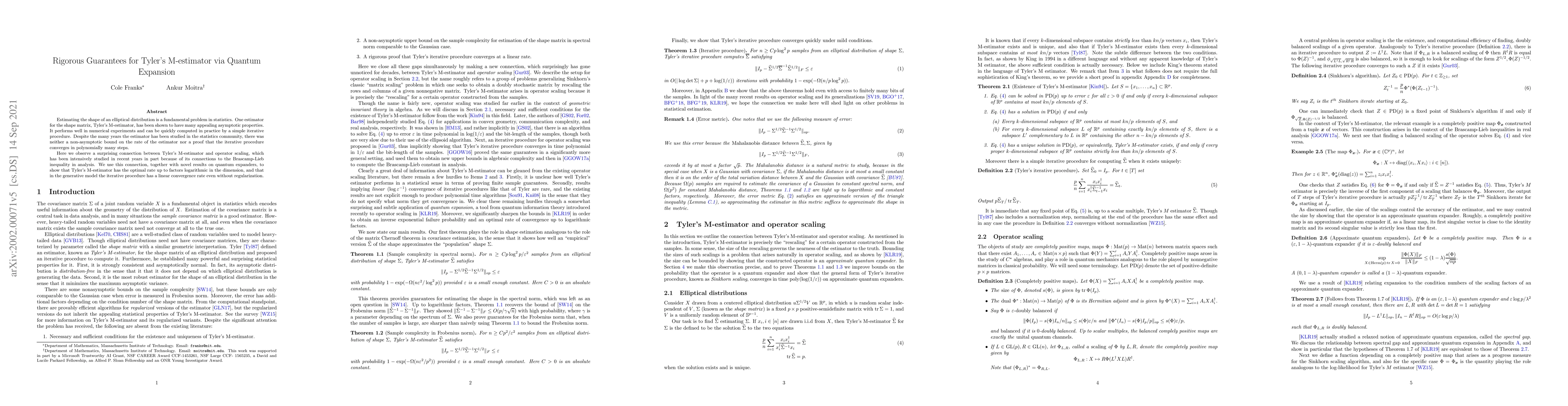 Estimating the shape of an elliptical distribution is a fundamental problem in statistics. One estimator for the shape matrix, Tyler's M-estimator, has been shown to have many appealing asymptotic properties. It performs well in numerical experiments and can be quickly computed in practice by a simple iterative procedure. Despite the many years the estimator has been studied in the statistics community, there was neither a tight non-asymptotic bound on the rate of the estimator nor a proof that the iterative procedure converges in polynomially many steps. Here we observe a surprising connection between Tyler's M-estimator and operator scaling, which has been intensively studied in recent years in part because of its connections to the Brascamp-Lieb inequality in analysis. We use this connection, together with novel results on quantum expanders, to show that Tyler's M-estimator has the optimal rate up to factors logarithmic in the dimension, and that in the generative model the iterative procedure has a linear convergence rate even without regularization.