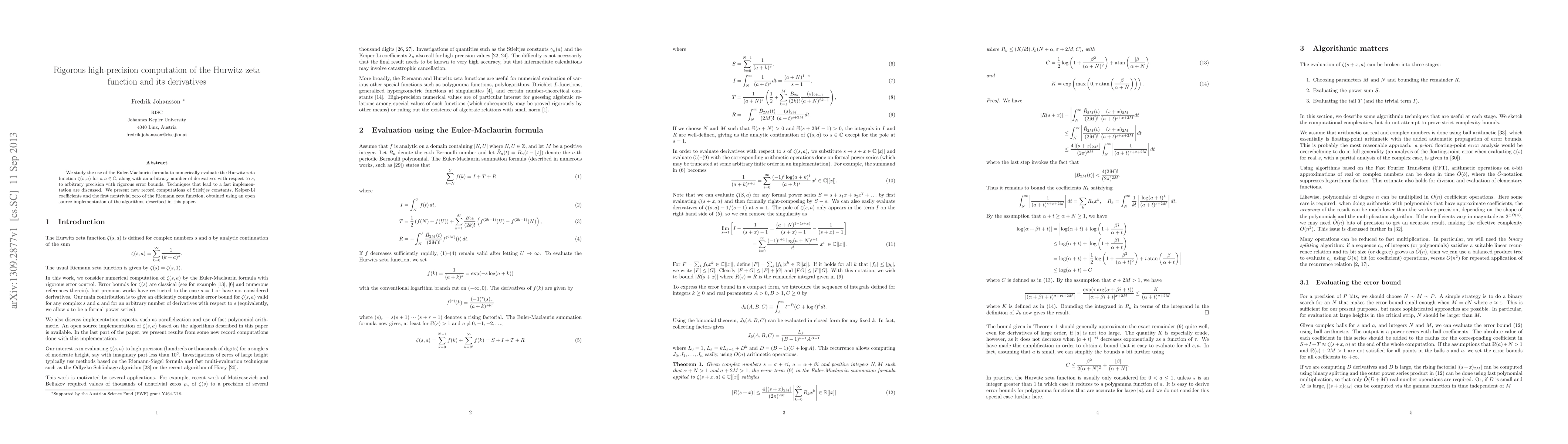 This paper develops a high-precision numerical method using the Euler-Maclaurin formula to evaluate the Hurwitz zeta function and its derivatives, achieving rigorous error bounds. It also reports new records in computations of Stieltjes constants, Keiper-Li coefficients, and the first nontrivial zero of the Riemann zeta function.