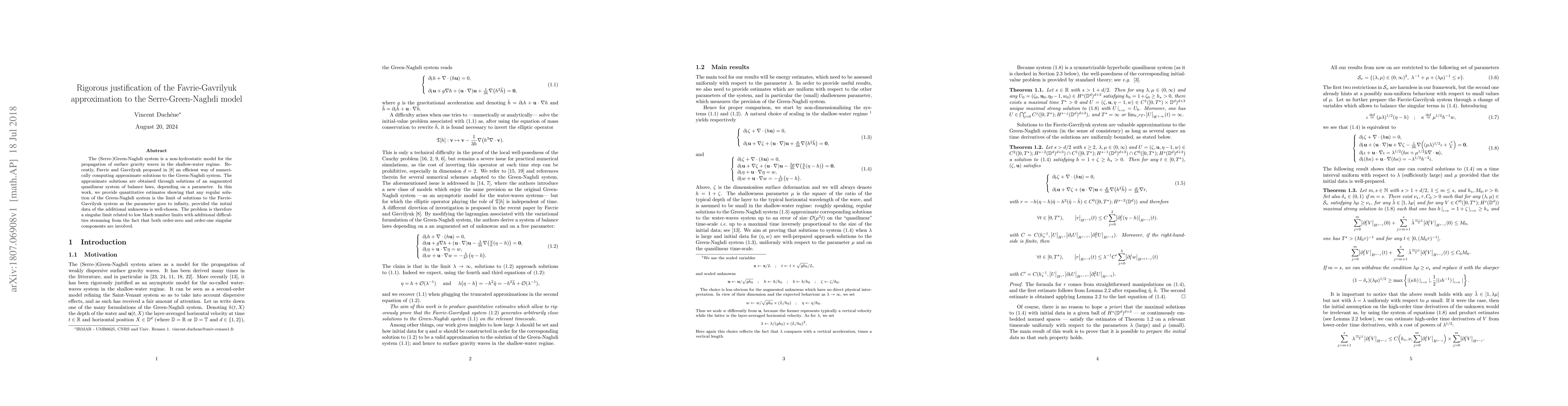 This paper rigorously justifies the Favrie-Gavrilyuk approximation to the Green-Naghdi model for shallow-water surface gravity waves, providing quantitative estimates that show the approximation converges to the exact solution as a parameter approaches infinity. The analysis addresses the singular limit nature of the problem.