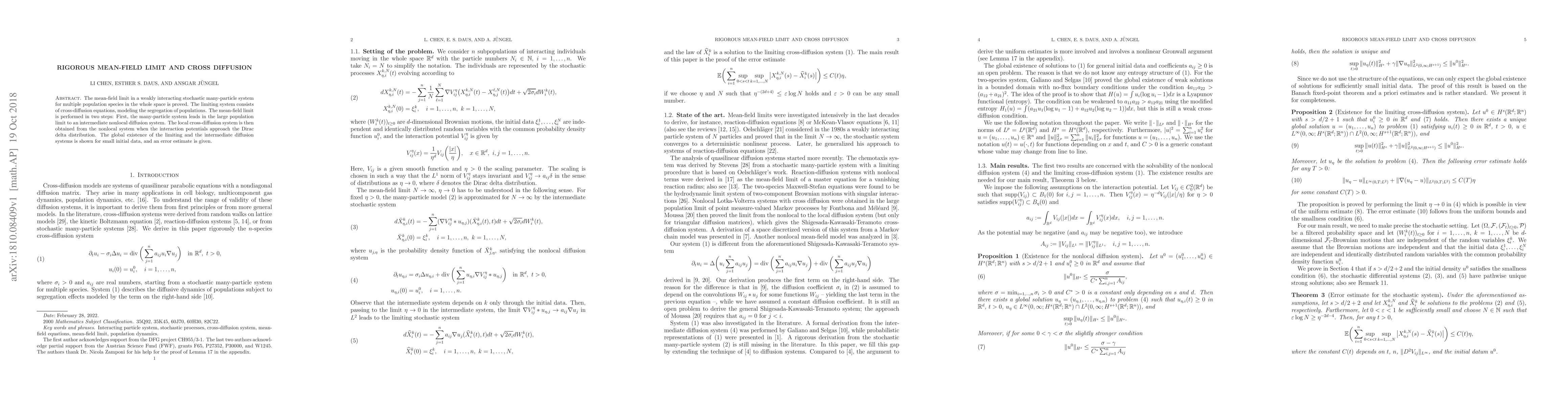 The mean-field limit in a weakly interacting stochastic many-particle system for multiple population species in the whole space is proved. The limiting system consists of cross-diffusion equations, modeling the segregation of populations. The mean-field limit is performed in two steps: First, the many-particle system leads in the large population limit to an intermediate nonlocal diffusion system. The local cross-diffusion system is then obtained from the nonlocal system when the interaction potentials approach the Dirac delta distribution. The global existence of the limiting and the intermediate diffusion systems is shown for small initial data, and an error estimate is given.