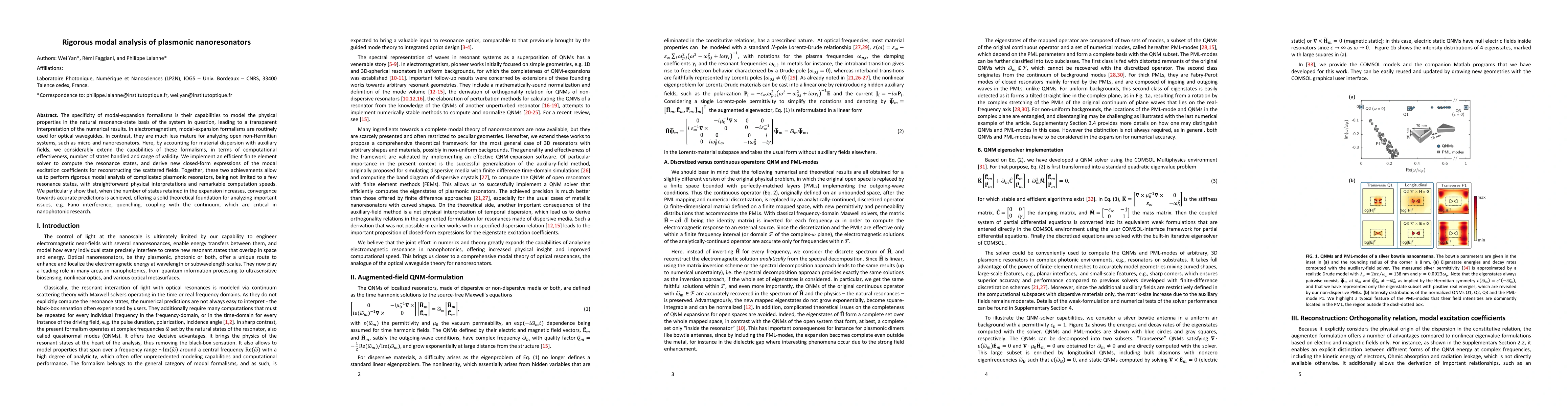 The specificity of modal-expansion formalisms is their capabilities to model the physical properties in the natural resonance-state basis of the system in question, leading to a transparent interpretation of the numerical results. In electromagnetism, modal-expansion formalisms are routinely used for optical waveguides. In contrast, they are much less mature for analyzing open non-Hermitian systems, such as micro and nanoresonators. Here, by accounting for material dispersion with auxiliary fields, we considerably extend the capabilities of these formalisms, in terms of computational effectiveness, number of states handled and range of validity. We implement an efficient finite element solver to compute the resonance states, and derive new closed-form expressions of the modal excitation coefficients for reconstructing the scattered fields. Together, these two achievements allow us to perform rigorous modal analysis of complicated plasmonic resonators, being not limited to a few resonance states, with straightforward physical interpretations and remarkable computation speeds. We particularly show that, when the number of states retained in the expansion increases, convergence towards accurate predictions is achieved, offering a solid theoretical foundation for analyzing important issues, e.g. Fano interference, quenching, coupling with the continuum, which are critical in nanophotonic research.
