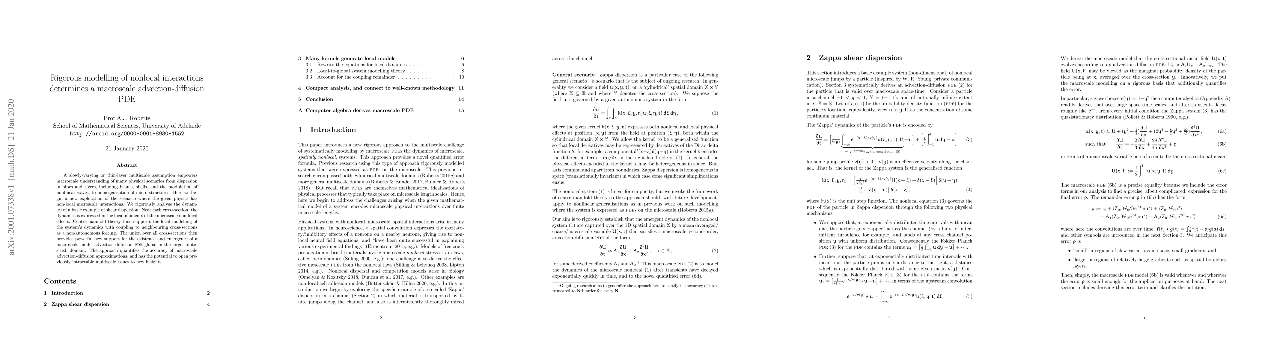 This paper rigorously models nonlocal interactions to derive a macroscale advection-diffusion partial differential equation (PDE) for slowly-varying physical systems. It uses centre manifold theory to couple local dynamics across cross-sections, providing a new framework for understanding multiscale phenomena and quantifying the accuracy of macroscale approximations.