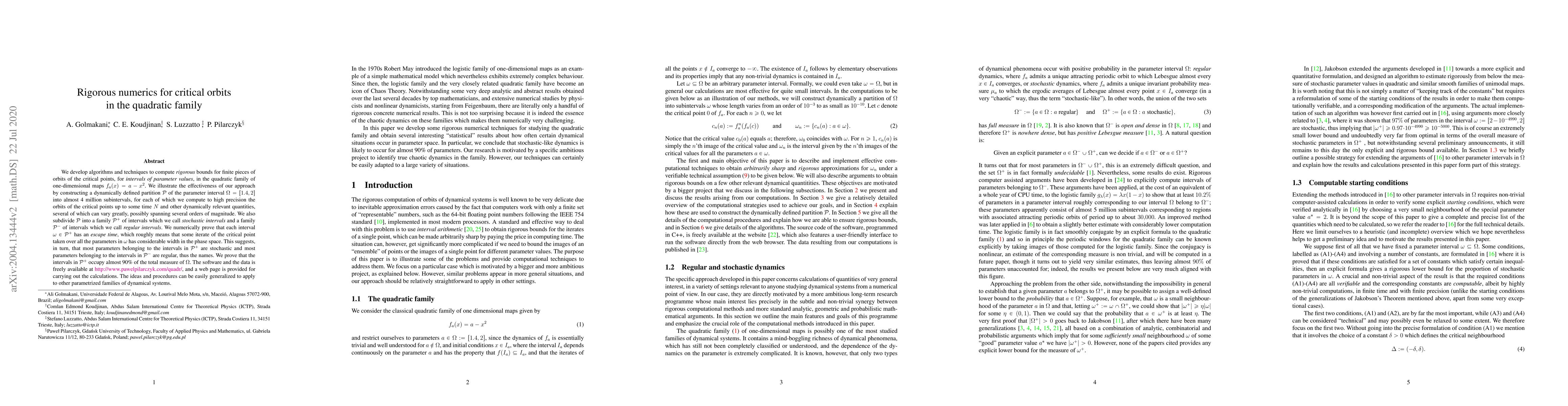 This research paper develops algorithms to compute rigorous bounds for orbits of critical points in a quadratic family map, revealing that almost 90% of parameter intervals are stochastic, while the remaining 10% consist of regular intervals.