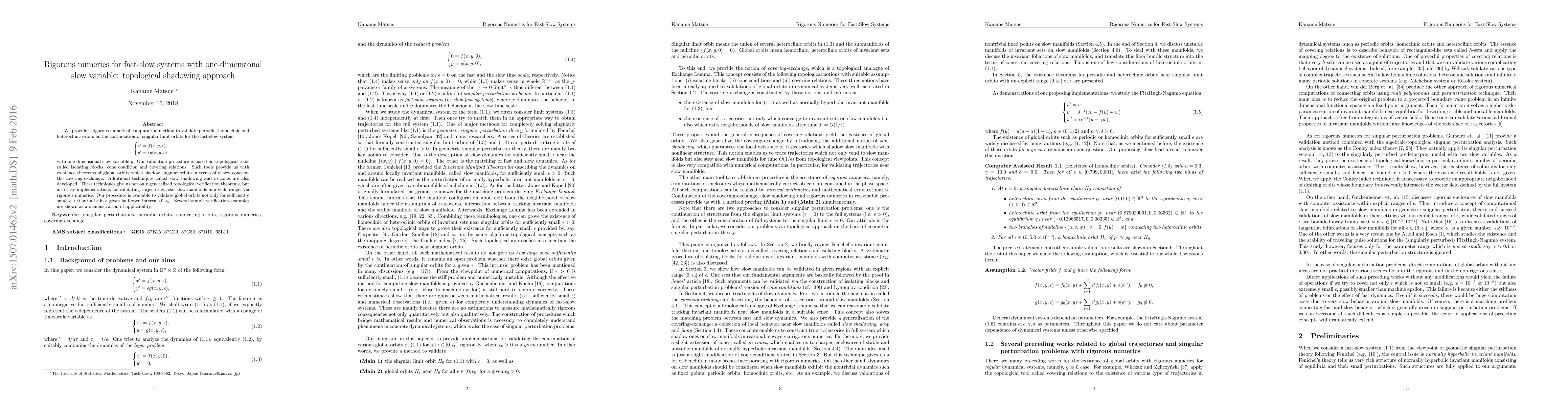 We provide a rigorous numerical computation method to validate periodic, homoclinic and heteroclinic orbits as the continuation of singular limit orbits for the fast-slow system $x' = f(x,y,\epsilon), y' = \epsilon g(x,y,\epsilon)$ with one-dimensional slow variable $y$. Our validation procedure is based on topological tools called isolating blocks, cone condition and covering relations. Such tools provide us with existence theorems of global orbits which shadow singular orbits in terms of a new concept, the covering-exchange. Additional techniques called slow shadowing and $m$-cones are also developed. These techniques give us not only generalized topological verification theorems, but also easy implementations for validating trajectories near slow manifolds in a wide range, via rigorous numerics. Our procedure is available to validate global orbits not only for sufficiently small $\epsilon > 0$ but all $\epsilon$ in a given half-open interval $(0,\epsilon_0]$. Several sample verification examples are shown as a demonstration of applicability.