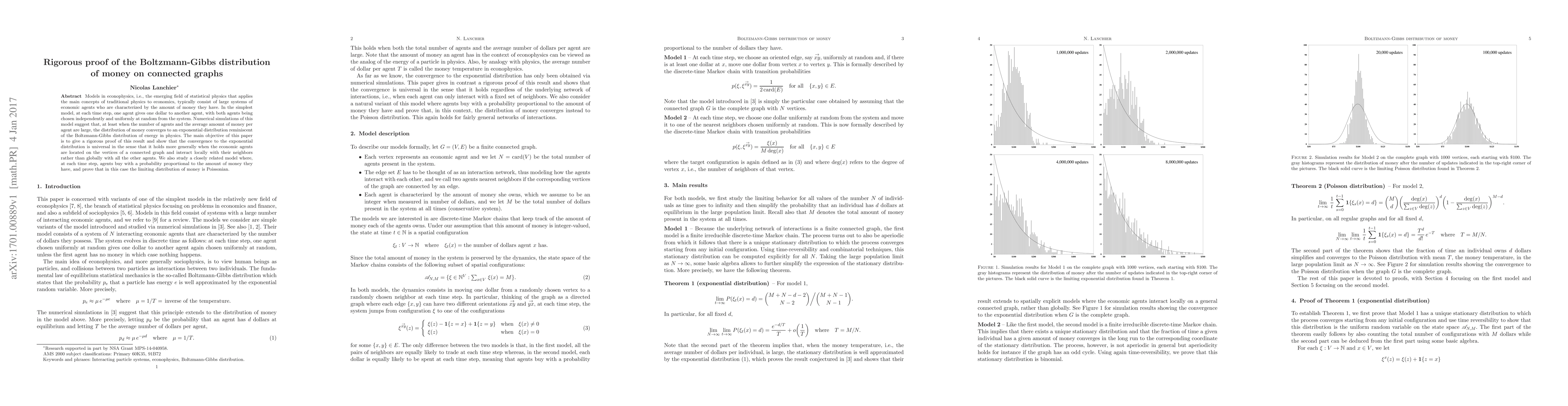 This paper rigorously proves that the distribution of money in economic models, where agents exchange money randomly, converges to an exponential distribution akin to the Boltzmann-Gibbs distribution in physics. It extends this result to agents on connected graphs interacting locally, and also proves that a related model with proportional buying leads to a Poissonian distribution of money.