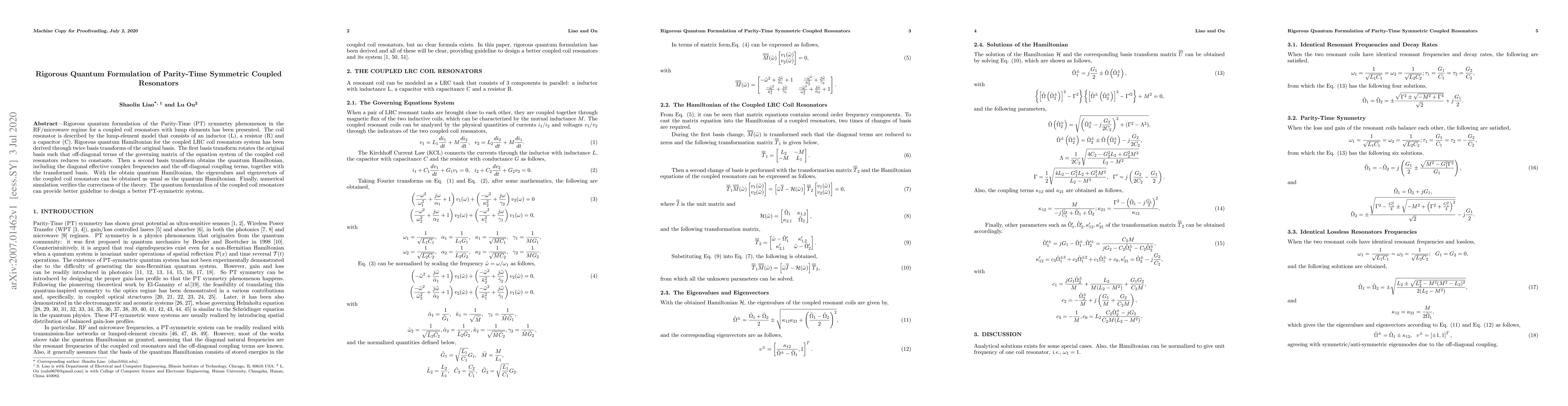 This paper presents a rigorous quantum formulation for the Parity-Time symmetry in coupled RF/microwave resonators using lump elements. The authors derive a quantum Hamiltonian through basis transforms, enabling the calculation of eigenvalues and eigenvectors, and validate the theory with numerical simulations.