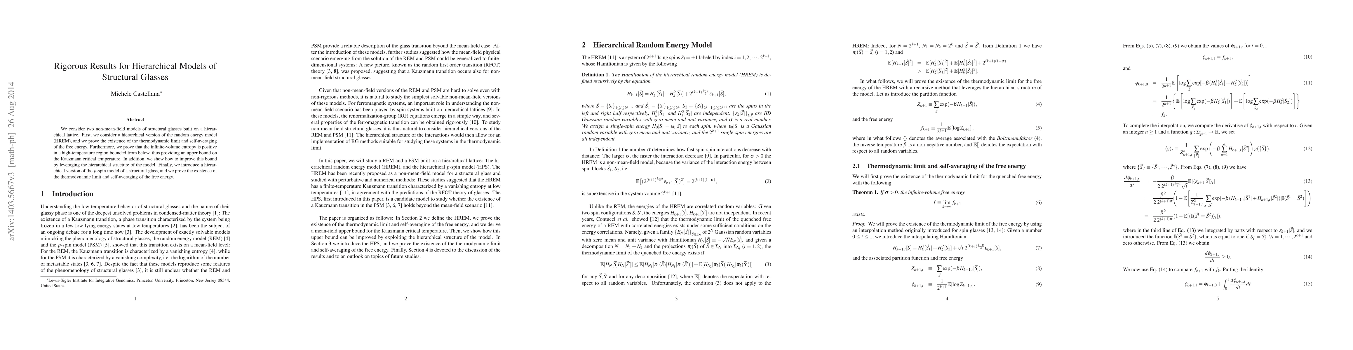 This paper rigorously proves the existence of thermodynamic limits and self-averaging of free energy for hierarchical models of structural glasses, including a hierarchical random energy model (HREM) and a hierarchical $p$-spin model. It also establishes a positive infinite-volume entropy in a high-temperature region, providing an upper bound on the Kauzmann critical temperature.