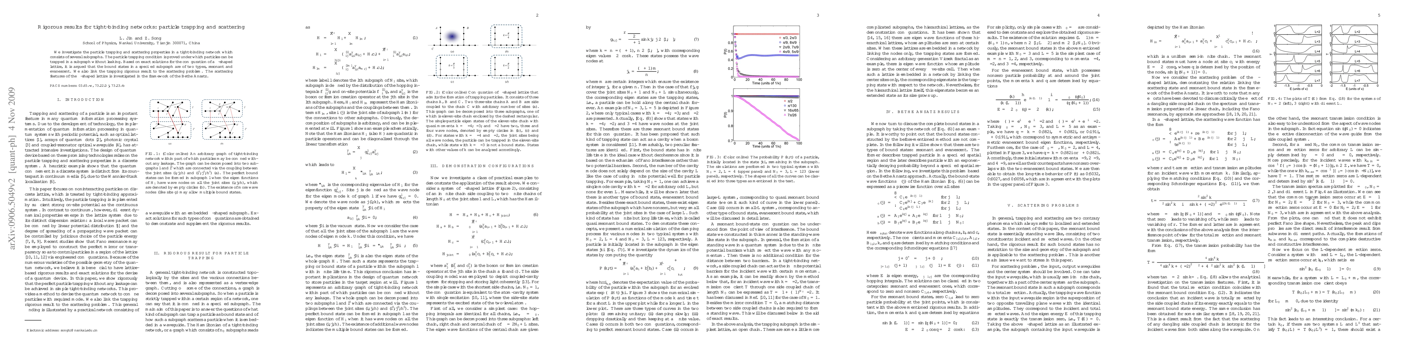 Researchers studied particle trapping in tight-binding networks, proving a condition for trapping particles without leakage. They found bound states can cause total reflection when embedded in a one-dimensional chain.