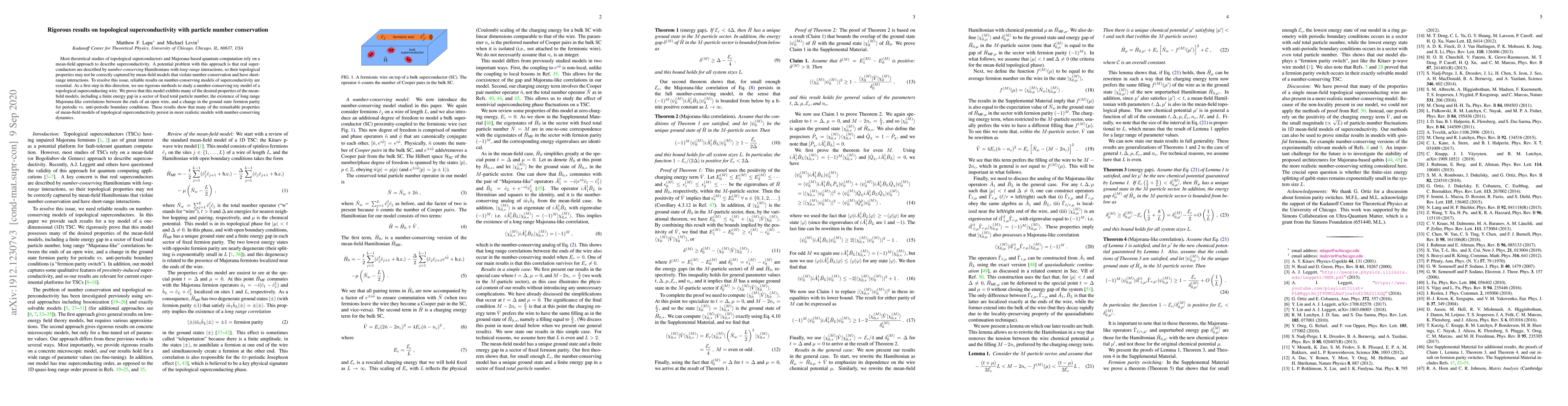 This paper rigorously proves that a number-conserving toy model of a topological superconducting wire exhibits key properties of mean-field models, including an energy gap, Majorana-like correlations, and a change in fermion parity, demonstrating the persistence of topological superconductivity in realistic, number-conserving Hamiltonians.