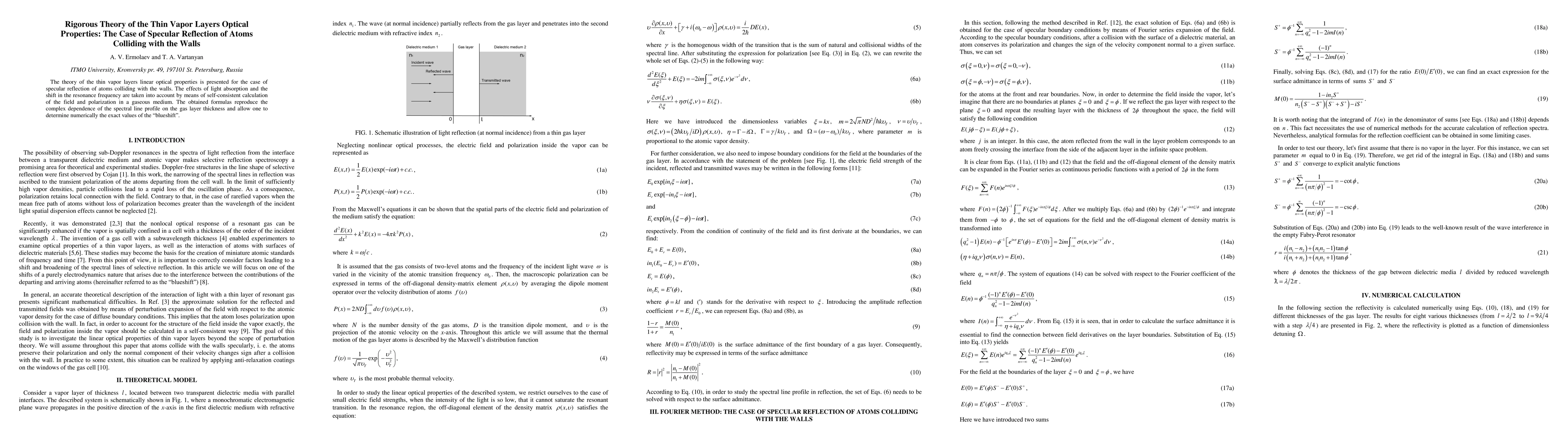 The theory of the thin vapor layers linear optical properties is presented for the case of specular reflection of atoms colliding with the walls. The effects of light absorption and the shift in the resonance frequency are taken into account by means of self-consistent calculation of the field and polarization in a gaseous medium. The obtained formulas reproduce the complex dependence of the spectral line profile on the gas layer thickness and allow one to determine numerically the exact values of the blueshift.