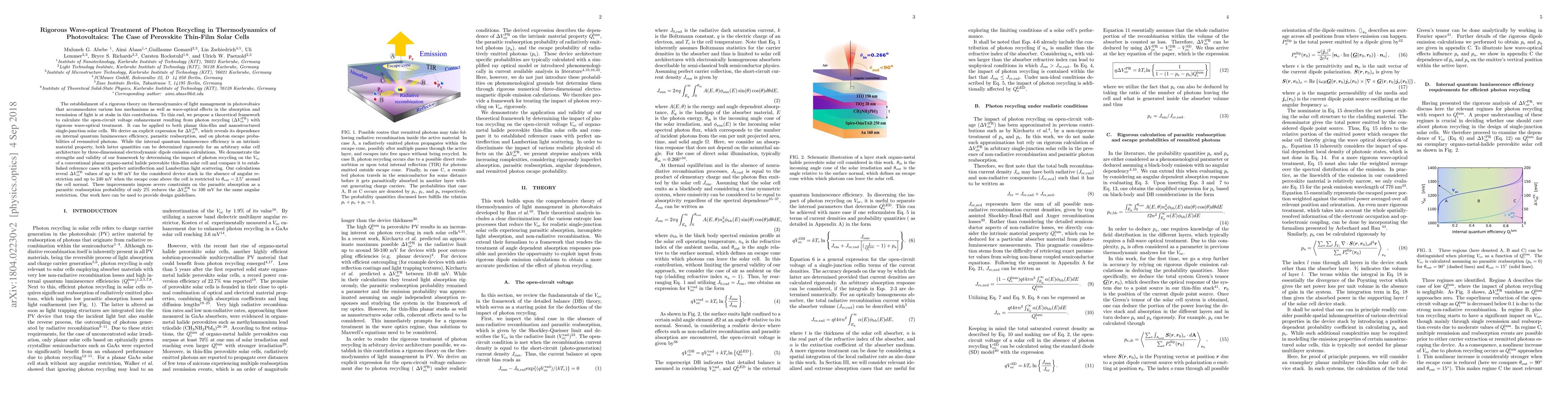 The establishment of a rigorous theory on thermodynamics of light management in photovoltaics that accommodates various loss mechanisms as well as wave-optical effects in the absorption and reemission of light is at stake in this contribution. To this end, we propose a theoretical framework to calculate the open-circuit voltage enhancement resulting from photon recycling ($\Delta V^{\mathrm{PR}}_{\mathrm{oc}}$) with rigorous wave-optical treatment. It can be applied to both planar thin-film and nanostructured single-junction solar cells. We derive an explicit expression for $\Delta V^{\mathrm{PR}}_{\mathrm{oc}}$, which reveals its dependence on internal quantum luminescence efficiency, parasitic reabsorption, and on photon escape probabilities of reemmited photons. While the internal quantum luminescence efficiency is an intrinsic material property, both latter quantities can be determined rigorously for an arbitrary solar cell architecture by three-dimensional electrodynamic dipole emission calculations. We demonstrate the strengths and validity of our framework by determining the impact of photon recycling on the $V_{\mathrm{oc}}$ of a conventional planar organo-metal halide perovskite thin-film solar cell and compare it to established reference cases with perfect antireflection and Lambertian light scattering. Our calculations reveal $\Delta V^{\mathrm{PR}}_{\mathrm{oc}}$ values of up to 80 mV for the considered device stack in the absence of angular restriction and up to 240 mV when the escape cone above the cell is restricted to $\theta_{\mathrm{out}}=2.5^\circ$ around the cell normal. These improvements impose severe constraints on the parasitic absorption as a parasitic reabsorption probability of only 2\% reduces the $\Delta V^{\mathrm{PR}}_{\mathrm{oc}}$ to 100 mV for the same angular restriction. Our work here can be used to provide design guidelines.